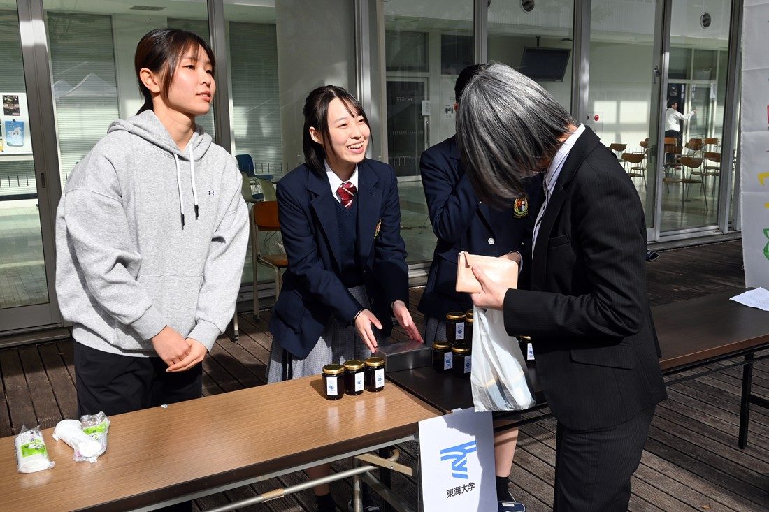 熊本星翔高の早田優奈さん(1年生)は、「ブルーベリーの収穫は初めてでしたが、学生や先生方が種類や取り方も丁寧に教えてくれました。臨空キャンパスを訪れたのも初めてで、充実した設備に驚きました」とコメント。坂梨侑衣さん(同)は、「農学部と聞くと畑や牧場で作業しているイメージでしたが、食品加工といった勉強もできると知り、楽しそうだと感じました」と話していました。来年度、農学部農学科に進学予定の津村真名美さん(3年生)は、「収穫や加工だけでなく、実際にお客さんの手に届くところまで体験し、商品を売る大変さを学びました。高校生のうちにこうした経験をできたことで、大学に進学した先を想像できました。果物が好きなので、果樹の栽培もしてみたい」と期待に胸を膨らませていました。