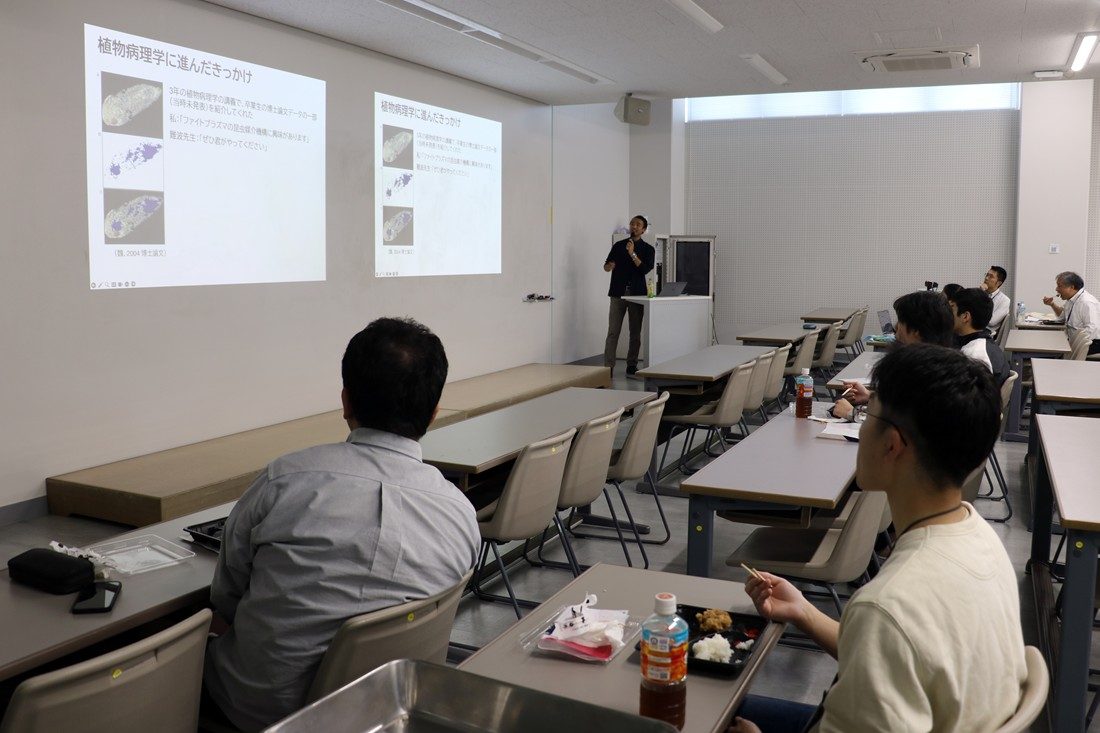 総合農学研究所では10月23日に阿蘇くまもと臨空キャンパスで、「第4回ランチョンセミナー」を開催しました。教員の研究内容や最新の研究話題を共有しようと月に1回程度開いているものです。今回は農学部農学科の鯉沼宏章講師が「『博く深く』を目指して―研究の歩みと展望―」をテーマに講演。学生や教職員約30名が参加しました。
