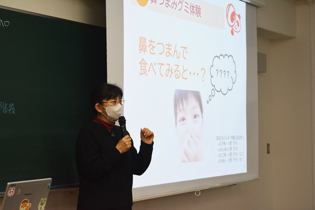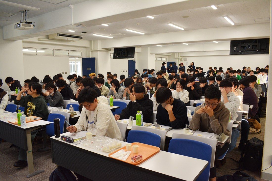 当日は味の素株式会社グローバルソリューション部の稲村多恵子氏を講師に招き、人間が感じる5つの基本の味(甘味、酸味、塩味、苦味、うま味)をテーマに講義しました。始めに、同社が開発した5つの味の液体を口に含んで判別する「味覚キット」を用いたワークショップに挑戦。鼻をつまんで嗅覚を遮断した状態で飲むなどさまざまな条件で試し、人間が味覚を感じ取る神経伝達の仕組みを学びました。続いて、昆布だしなどに含まれる“うま味”の成分であるグルタミン酸について稲村氏が説明し、学生たちは同社が販売するうま味調味料を添加した白米を試食しました。学生たちは、授業で学んだことを踏まえて味覚キットの新たな活用方法について検討し、12月8日に同社担当者に向けてプレゼンテーションする予定です。清水教授は、「水産学科は食品メーカーに就職する学生が多いため、企業の取り組みや実情を学ぶ機会を設けたいと考え企画しました。私たちが日ごろ食べている食品を構成する“5つの味”はどんな原料に含まれているのか、食品加工の現場ではどのように活用されているのかについて、企業の方から学び、研究やキャリア形成に生かしてもらいたい」と話しています。
