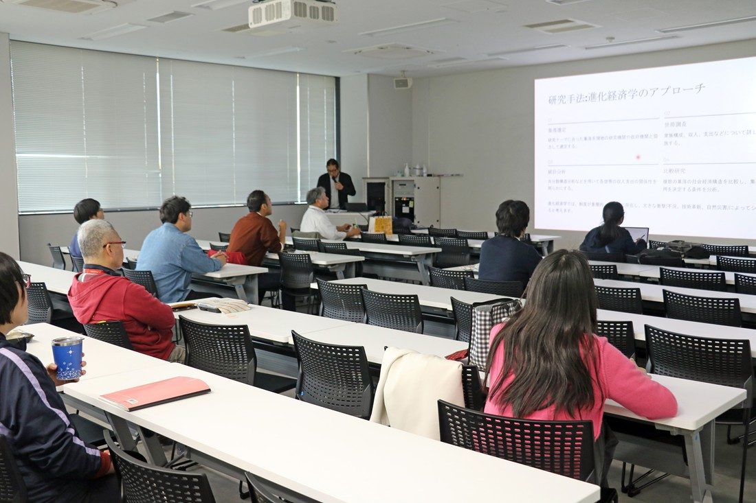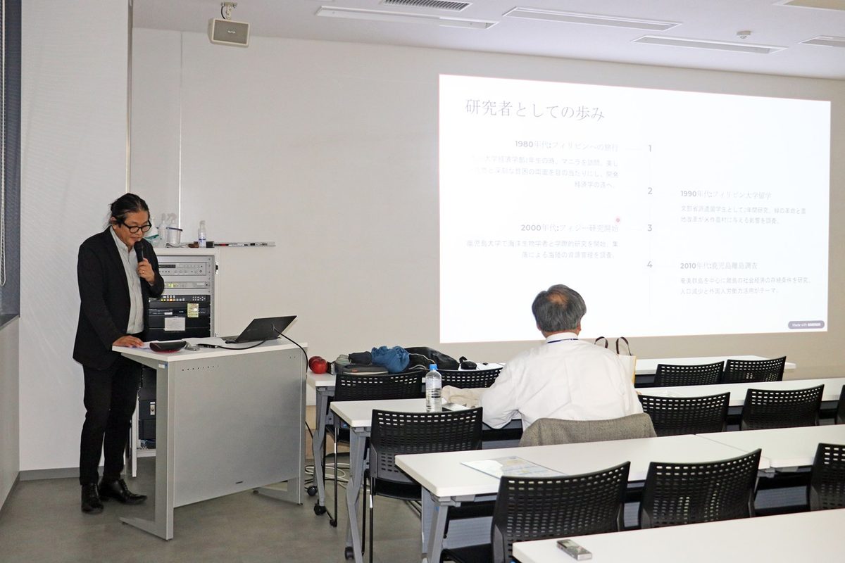 総合農学研究所では11月25日に阿蘇くまもと臨空キャンパスで、「第5回ランチョンセミナー」を開催しました。教員の研究内容や最新の研究話題を共有しようと月に1回程度開いているものです。今回は文理融合学部経営学科の西村知教授が「東南アジア・南太平洋・鹿児島離島の集落と地域経済の魅力」をテーマに講演。学生や教職員約20名が参加しました。