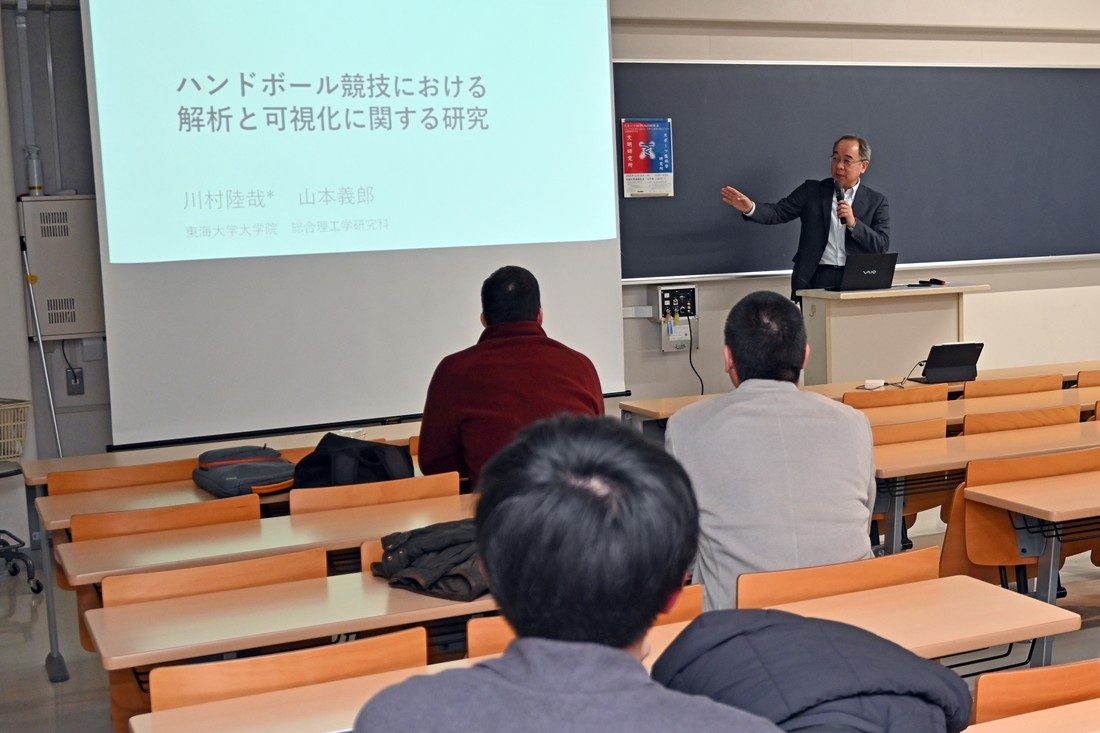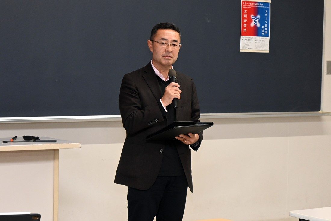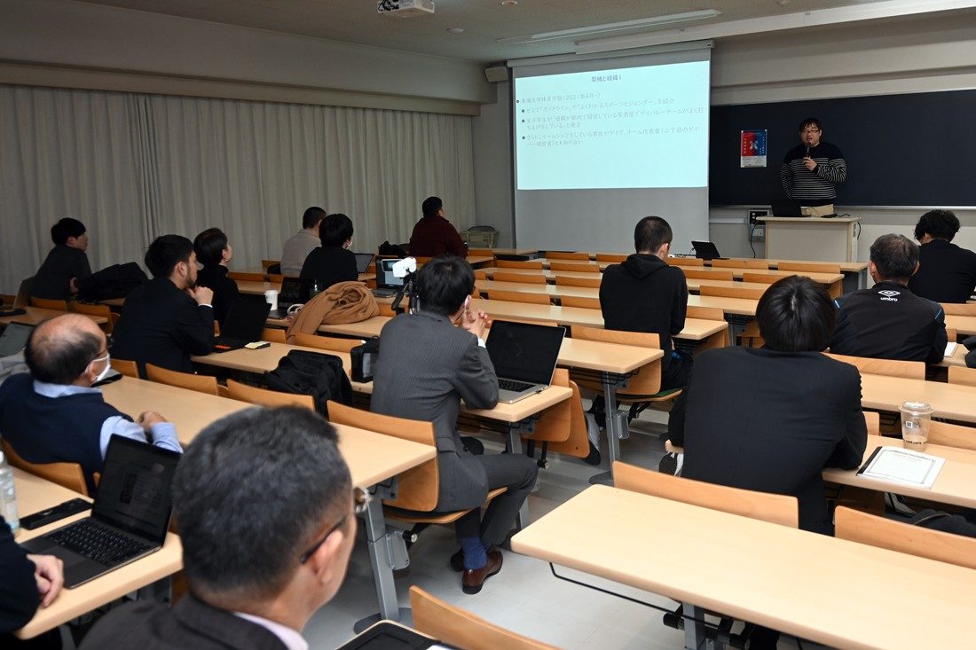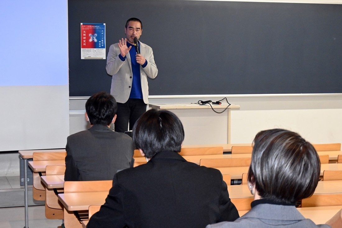 スポーツ医科学研究所と文明研究所が中心となって12月10日に湘南キャンパスで、「スポーツ科学UNIT研究会」を開催しました。本学では幅広い分野の共同研究を促進して大学全体の研究力底上げを図ることなどを目的に、2015年に「研究の峰形成『研究交流会』」を開催。そこで生まれた「スポーツ科学UNIT」では、分野を問わずさまざまな視点からスポーツ科学について議論を深める場を設けてきました。今回は文明研も加わって文理横断的な研究会として初めて企画し、学生や教職員ら約40名が参加しました。
