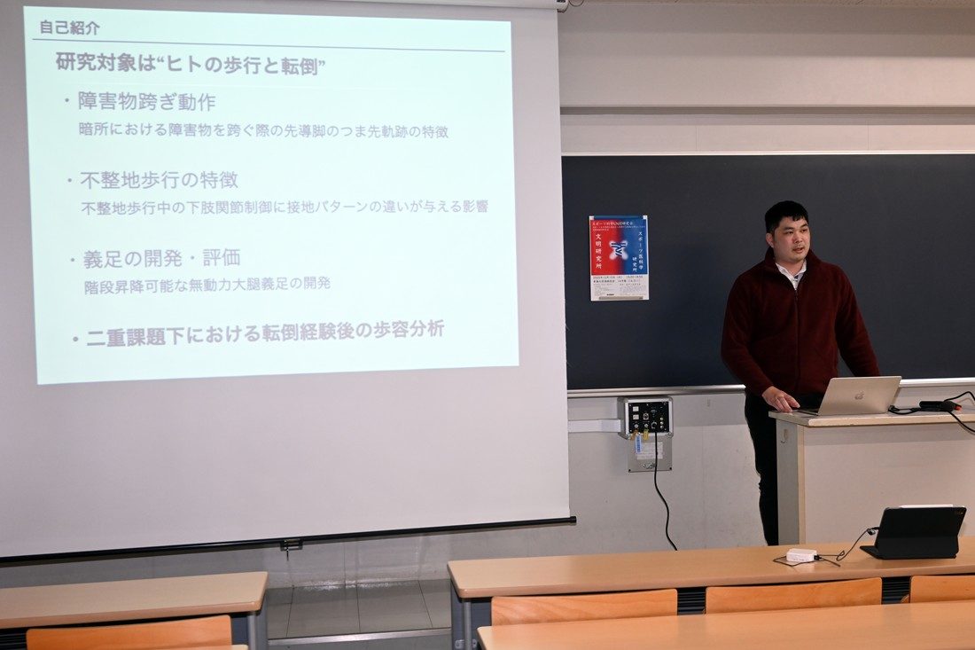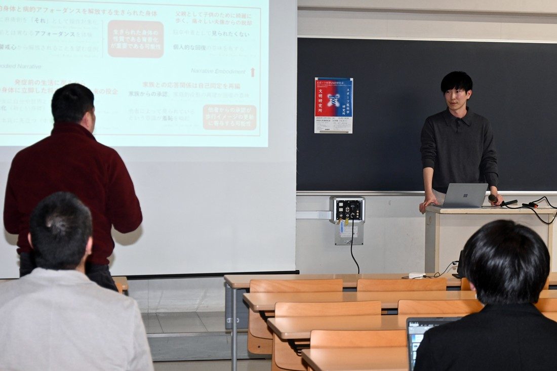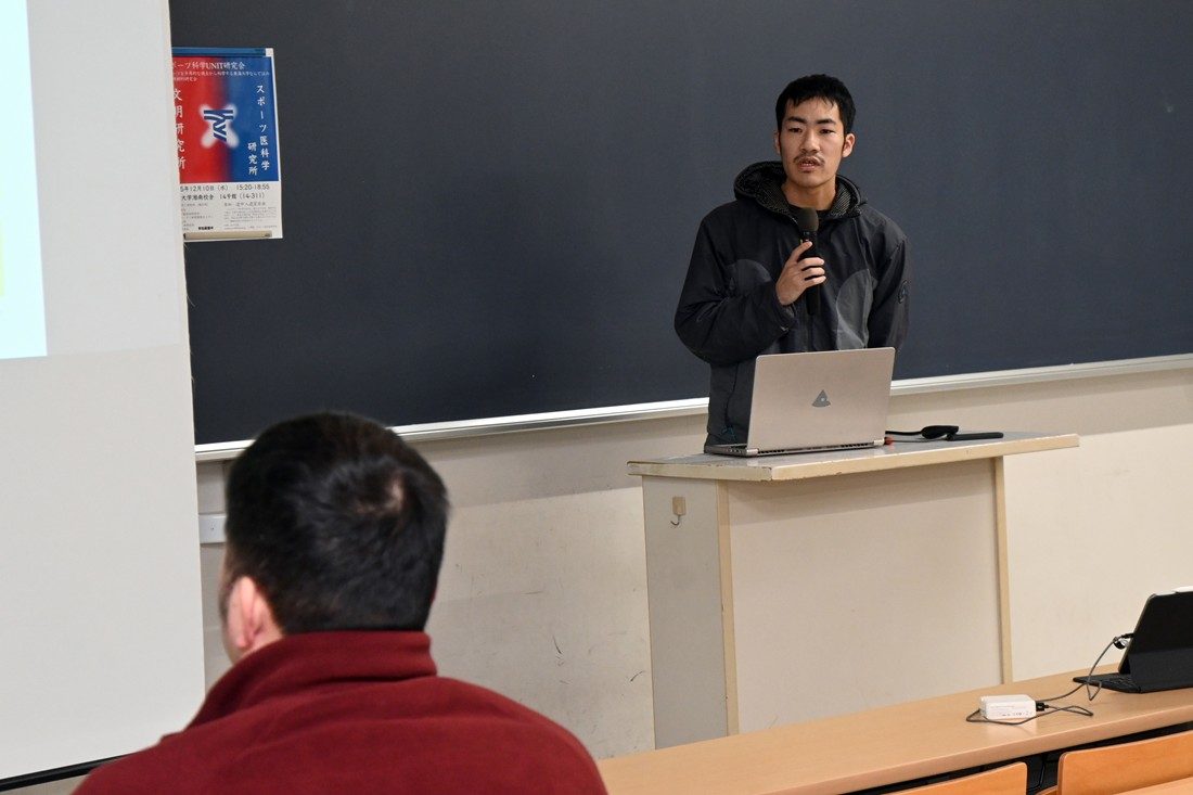 初めに文明研の田中彰吾所長が、「両研究所では学際的な内容に熱心に取り組んでおり、人文社会系のプロジェクトなど共通する部分も多くあります。私自身もスポ医研の山田洋所長とは15年以上前から運動学習について議論してきました。本研究会も活発な意見交換の場になることを期待しています」と研究会開催の経緯や趣旨を語りました。続いて教員や学生ら8名が研究内容を発表しました。理学療法士として脳卒中患者のリハビリテーションにも従事している文明研の三枝信吾特定研究員は、患者の主観的経験の変化を時系列で分析し歩行回復における身体性と物語性の関係について発表しました。スポ医研の五十嵐健太研究員は、スマートフォン使用中の転倒経験が歩行パターンに与える影響を実験的に検証した成果を解説。理学部数学科の山本義郎教授はハンドボールの統計的分析について発表し、宮城島晃大さん(大学院体育学研究科博士後期課程1年次生)はスポーツ観戦時の脳波測定の結果から会場の一体感と満足度の相関性などを説明しました。