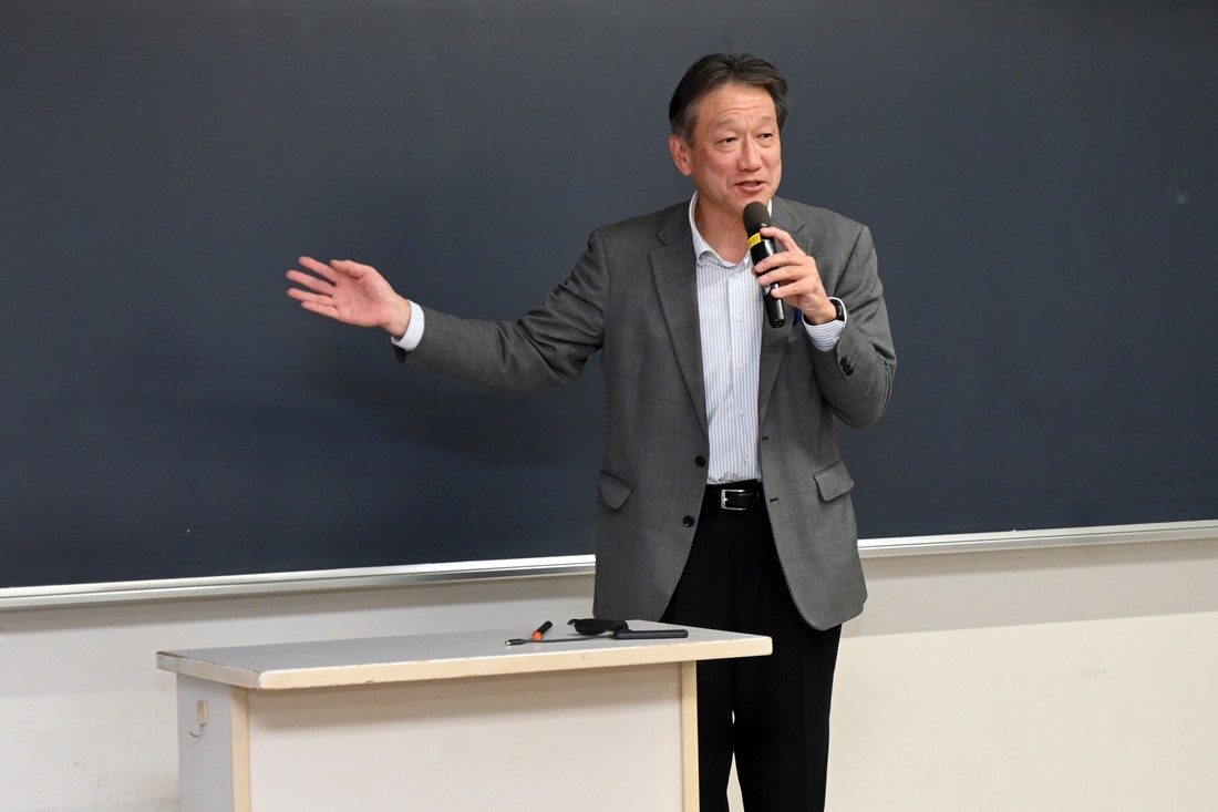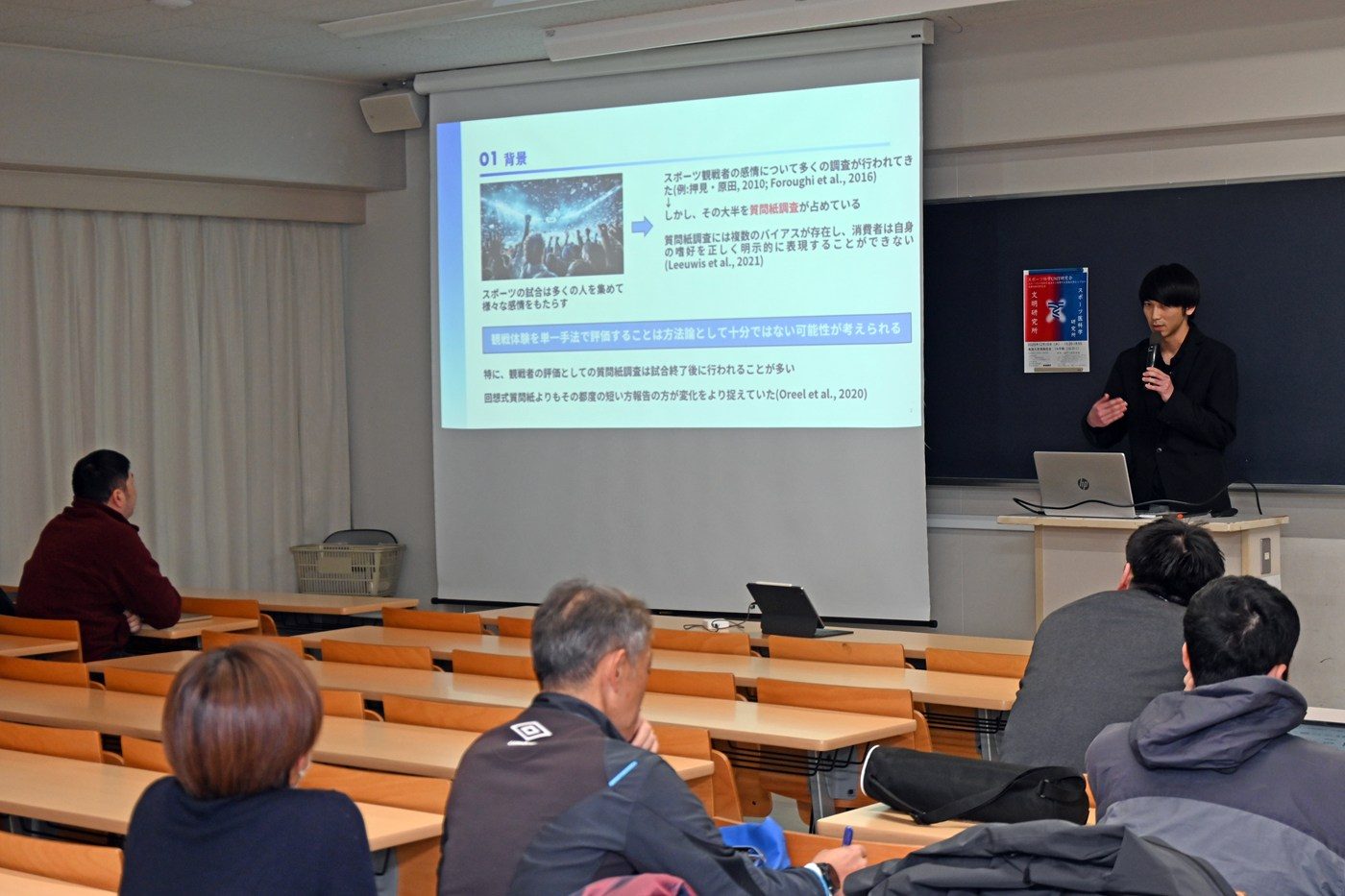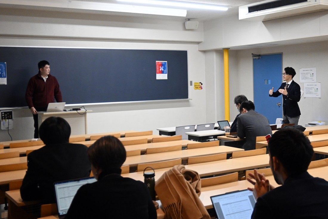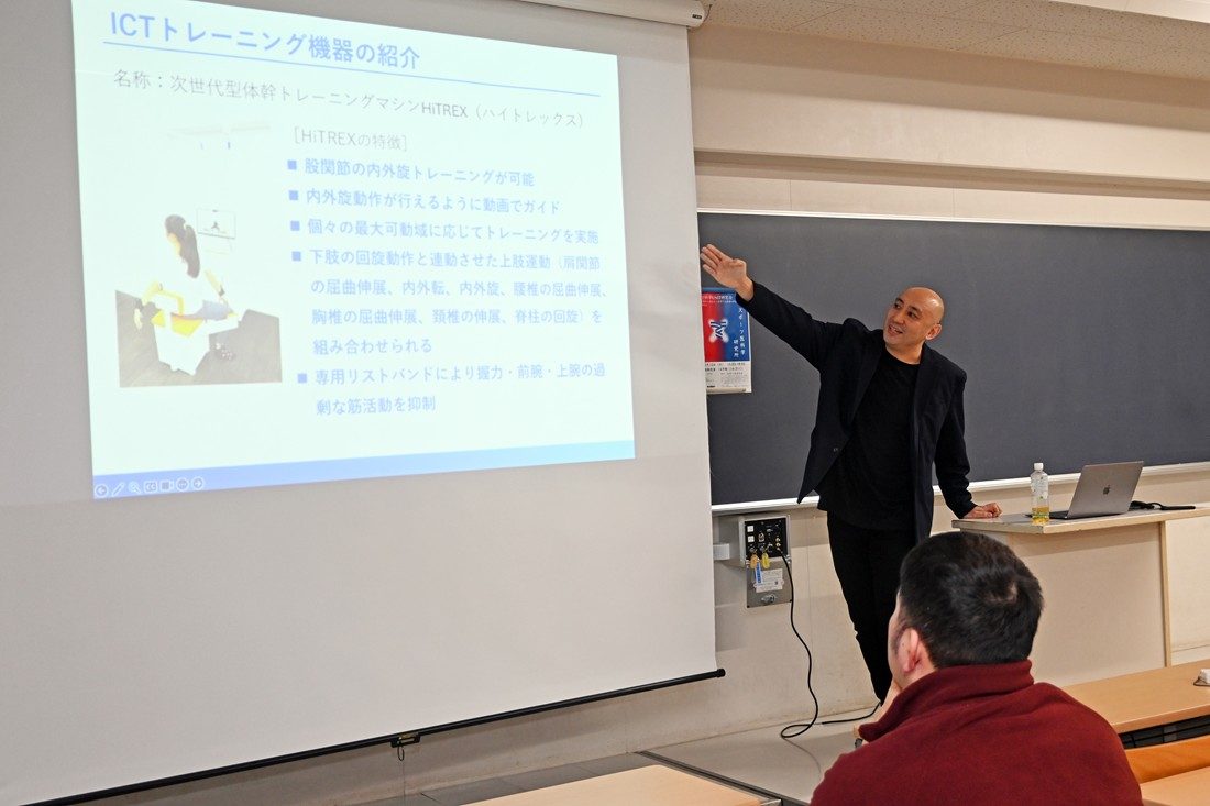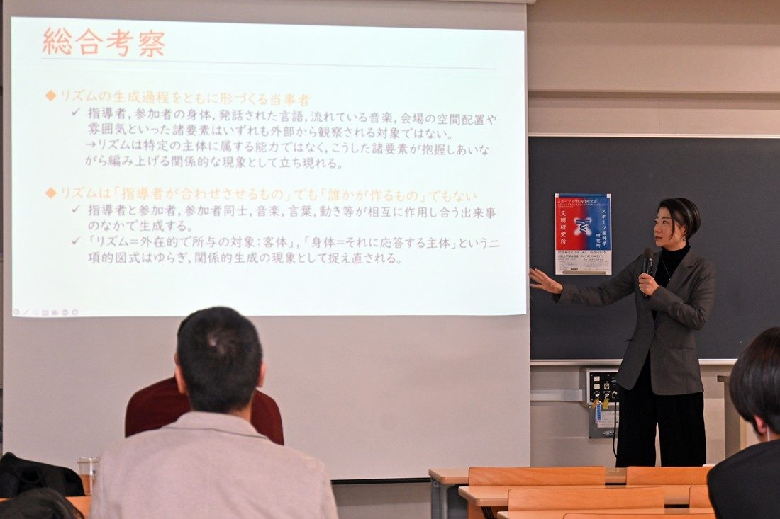 また、ベンチャー企業の経営者でもある岸陽さん(同)は股関節トレーニング機器「HiTREX」の開発について紹介。体育学部生涯スポーツ学科の田巻以津香准教授はリズムに関する哲学的考察を解説するとともに、知的障がい者とのダンス活動についても発表しました。同じく生涯スポーツ学科の谷木龍男准教授は性的マイノリティとスポーツに関する研究を紹介し、曾根田憲吾さん(工学部機械工学科4年次生)は極低温の冷却刺激を利用して身体の自然治癒力や回復力を高める「クライオセラピー」の効果測定について解説。各発表後には聴講者から多くの質問や感想が寄せられました。発表を聞いた体育学部長で大学院体育学研究科長の内山秀一教授は、「社会課題と関わる研究が多く、今日の発表や議論が今後の研究を深めることにつながると期待しています」と講評。スポ医研の山田所長は、「教員だけでなく大学院生や学部生の発表もあり、さまざまな要素がつまった研究会になりました。各研究所が力を合わせることで幅が広がり、深みが増します。今後も本学のよさを生かしてよりよい研究ができる場をつくっていきたい」とまとめました。