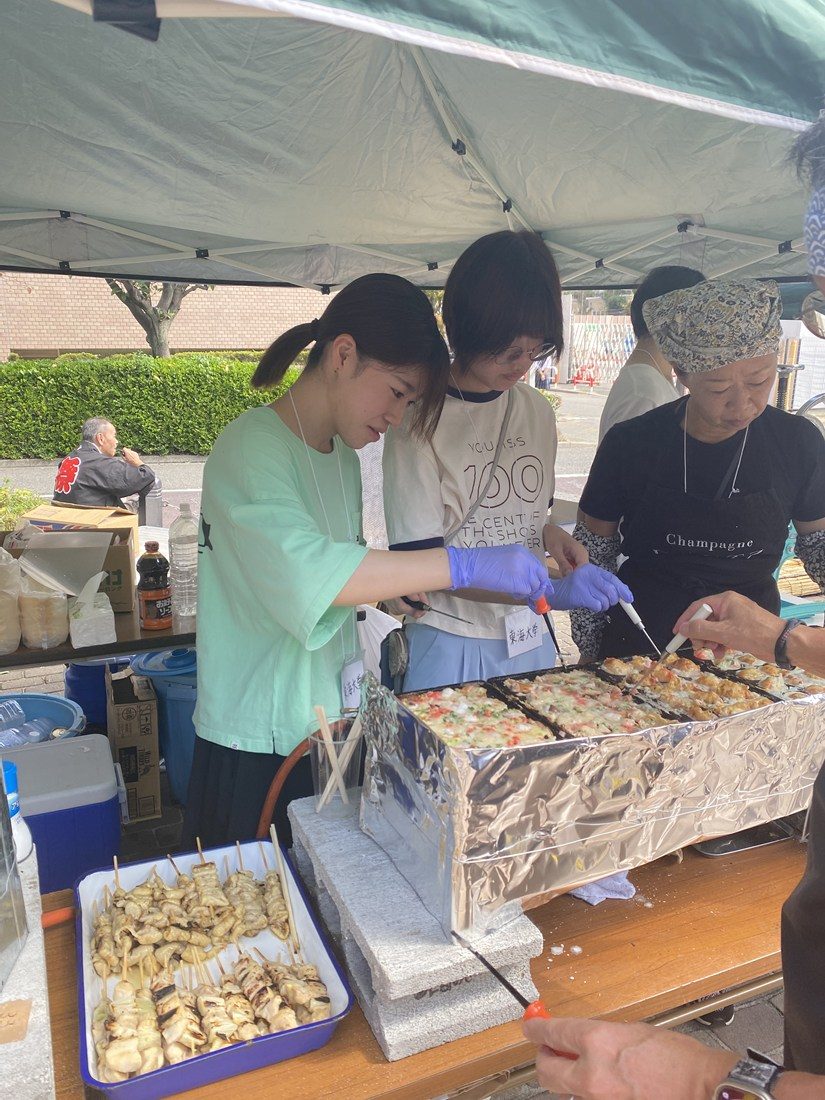大伴もかさん(2年次生)は、「提灯を紐にくくりつけて電球を入れたり、テントや机を組み立てたり、最初の準備から手伝いました。たこ焼きづくりではアルバイトの経験が役立ち、子どもたちからは“おいしい”や“ありがとう”、また地域の人たちからは“助かったよ”とか“また手伝いに来てね”といった声をかけてもらい、とてもうれしかったです。他大学の学生や先輩たちとも協力して継続的に携わることで育まれる地域の人との信頼関係の大切さも実感しました。これからも勉強と共にこうした活動にも関わり、自分の将来の可能性を少しずつ見つけていきたい」と話しました。