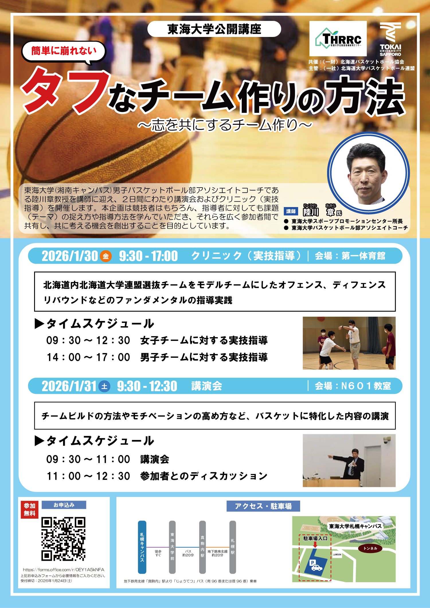 東海大学(湘南キャンパス)の男子バスケットボール部前監督で現在はアソシエイトコーチを務める陸川章教授を講師に迎え、2日間にわたりクリニック(実技指導)および講演会を行います。本企画は、競技者はもちろん、指導者の皆さまにも課題(テーマ)の捉え方や指導方法を学んでいただき、それらを広く参加者間で共有し、共に考える機会を創出することを目的としています。参加には事前のお申し込みが必要です。ぜひご来場ください。