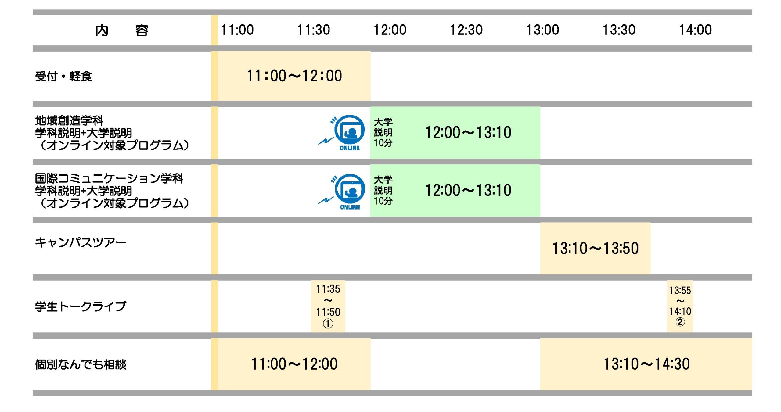 開催時間は、学科・来場型・オンライン型により異なります。タイムスケジュールをご覧ください。