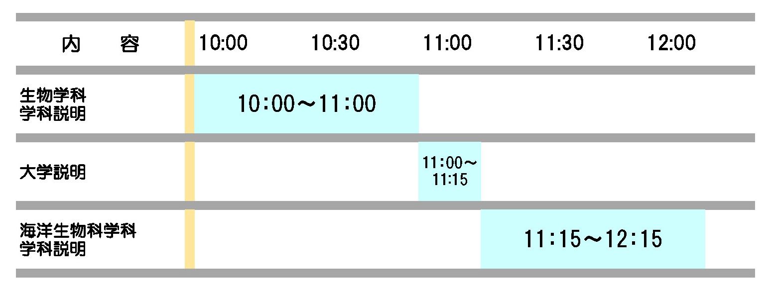 国際文化学部(地域創造学科、国際コミュニケーション学科)は来場型とオンライン型の同時開催、生物学部(生物学科、海洋生物科学科)はオンライン型で実施いたします。