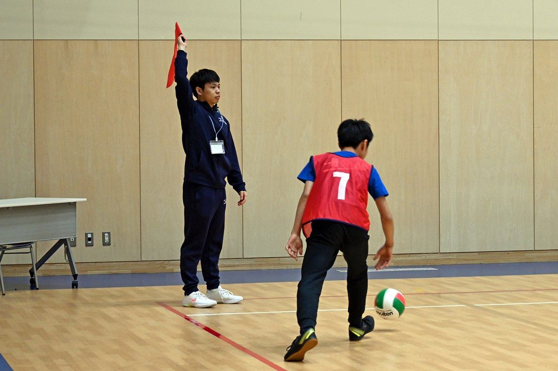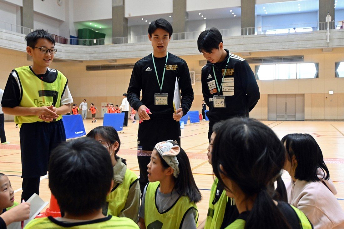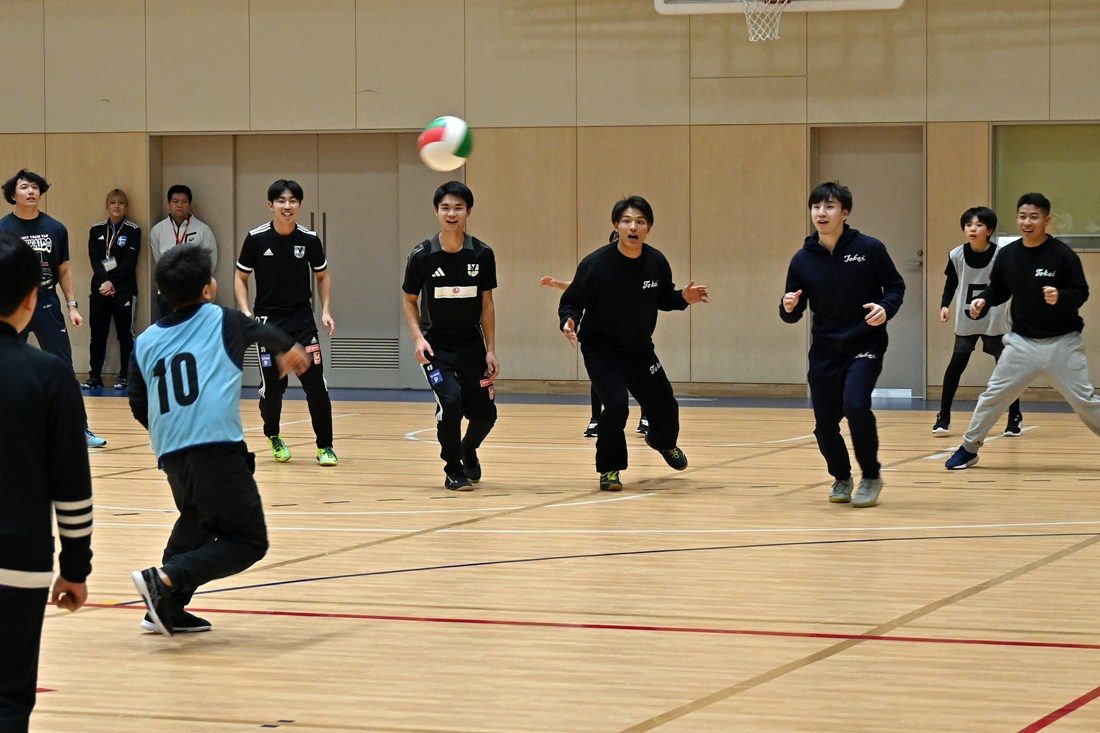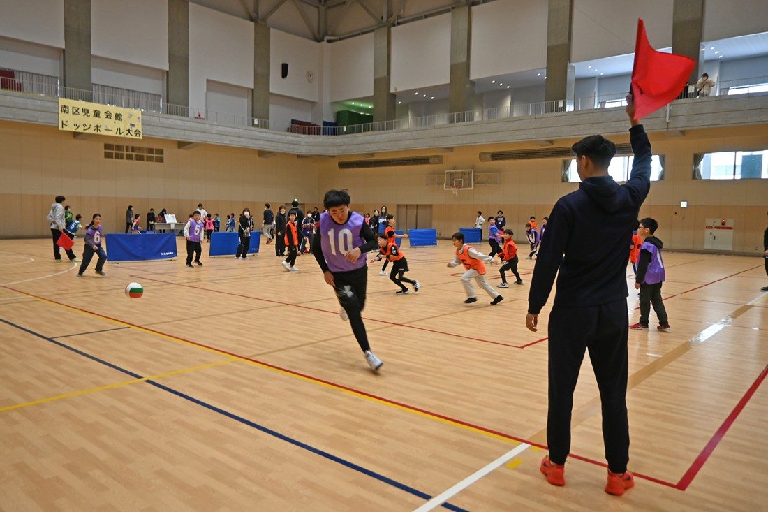 大会当日は、約270名の小学生が低学年と高学年に分かれて試合を重ねる中、学生24名が児童会館のスタッフと共に進行や子どもたちの誘導・見守りなどの役割を担い、試合中にはコートの4隅に立つ線審も務めました。また、最後には小学生の選抜チームとエキシビジョンマッチも行い、学生たちが投げるボールや身のこなしに歓声が上がりました。大会を運営する真駒内児童会館の中川由紀館長は、「区内には3面分のコートを取れるほどの施設がなかなかないので、毎年運営に協力いただき感謝しています。子どもたちにとって、日ごろあまり会えない大学生との交流が楽しく、大切な思い出になっています」と話しました。