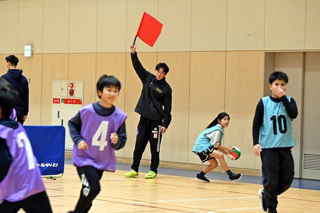 大会当日は、約270名の小学生が低学年と高学年に分かれて試合を重ねる中、学生24名が児童会館のスタッフと共に進行や子どもたちの誘導・見守りなどの役割を担い、試合中にはコートの4隅に立つ線審も務めました。また、最後には小学生の選抜チームとエキシビジョンマッチも行い、学生たちが投げるボールや身のこなしに歓声が上がりました。大会を運営する真駒内児童会館の中川由紀館長は、「区内には3面分のコートを取れるほどの施設がなかなかないので、毎年運営に協力いただき感謝しています。子どもたちにとって、日ごろあまり会えない大学生との交流が楽しく、大切な思い出になっています」と話しました。