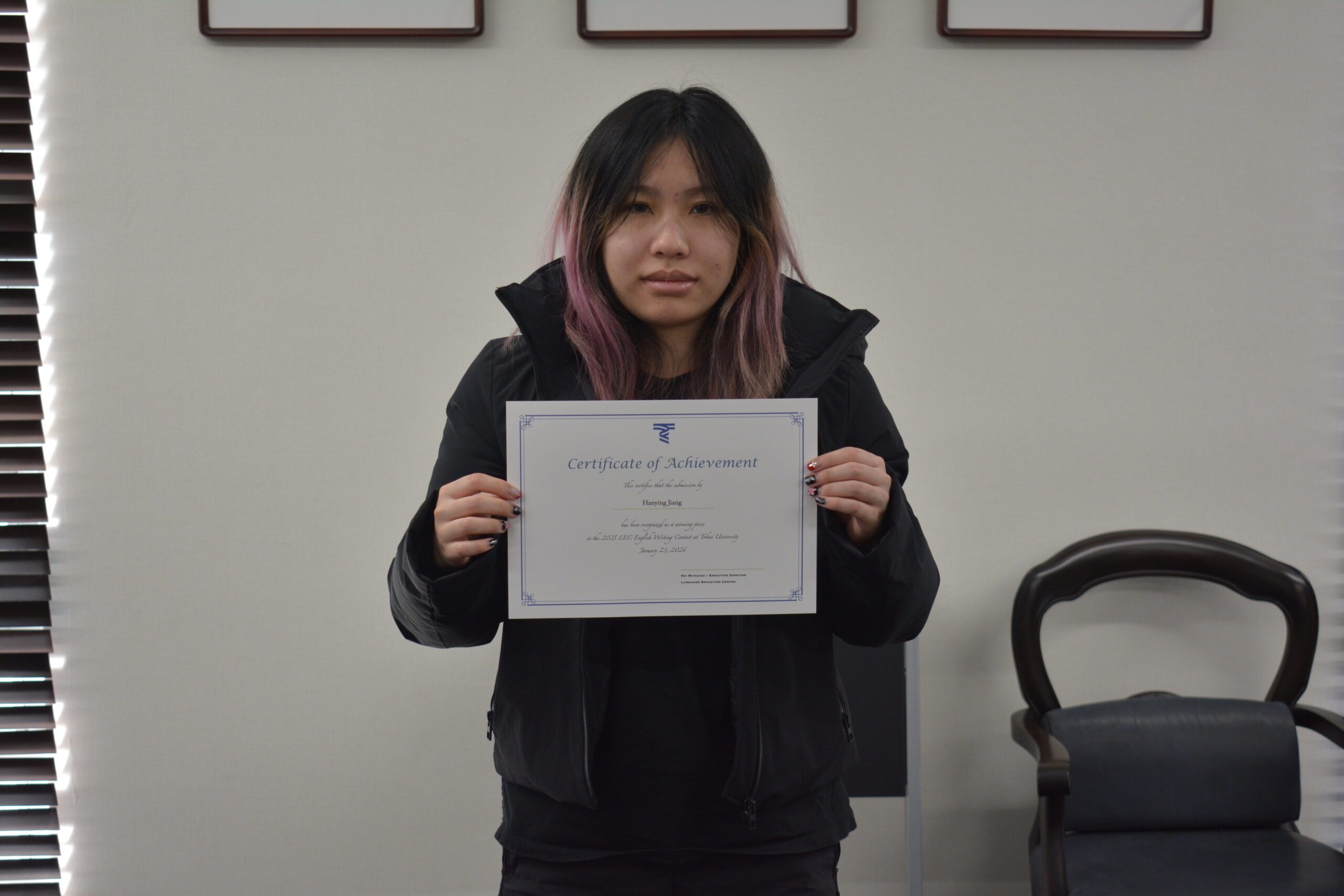 水産学科のJiang Hanying(コウ カンエイ)さんは、「故郷である中国四川省での生活や友人との食事の好みの違いなどについて書きました。優秀作品に選ばれたことを家族に報告したら家族も喜んでいました。提出にあたり、多くのサポートをしてくださった先生方に感謝しています」と受賞の喜びを話しました。