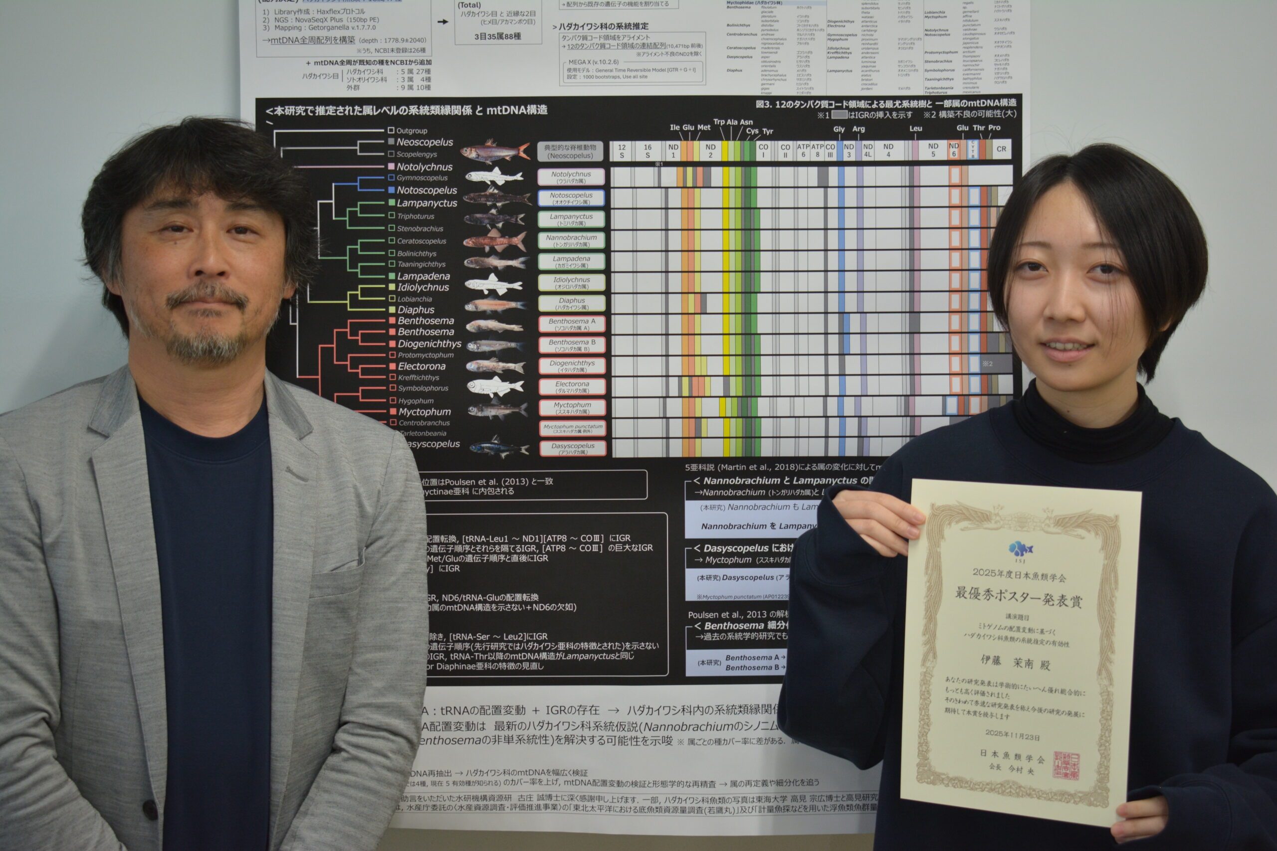 野原健司教授(海洋学部海洋生物学科)の研究室に所属する研究生の伊藤茉南さんがこのほど、日本魚類学会の「2025年度最優秀ポスター発表賞」を受賞しました。2025年11月21日から24日まで東京海洋大学で開かれた「日本魚類学会年会」で発表した「ミトゲノムの配置変動に基づくハダカイワシ科魚類の系統推定の有効性」の内容が評価されました。