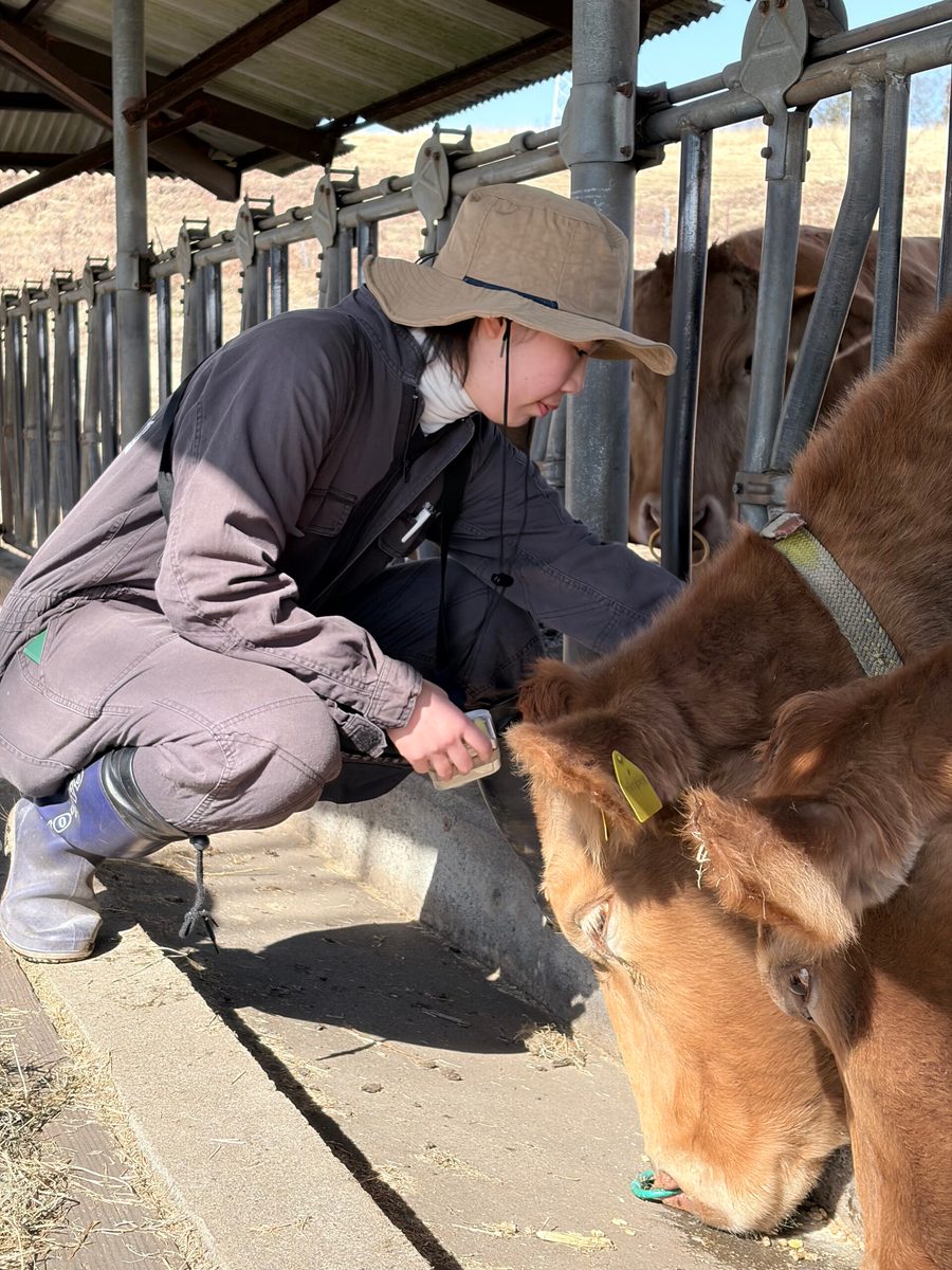 山口県出身の賀來さんは、「動物のことを学びたい」と農学部動物科学科に入学し、3年次生の夏に研究室を決める際に「熊本ならではのあか牛について研究してみたい」と動物生理生態学研究室に入りました。「あか牛の目線で半自然草地の重要性を証明し、人工草地を増やすことなく半自然草地を維持することが、文化的景観や生物多様性の維持につながると感じています。ドローンを使った草地の栄養状態の把握や安価で行動を分析できる装置を開発できれば、阿蘇地域の畜産農家さんの手助けにも繋がります。どの研究もまだ課題はあるので、採択は終わりますがもう1年研究を続けてよりよい結果を求めていきたい」と話しています。