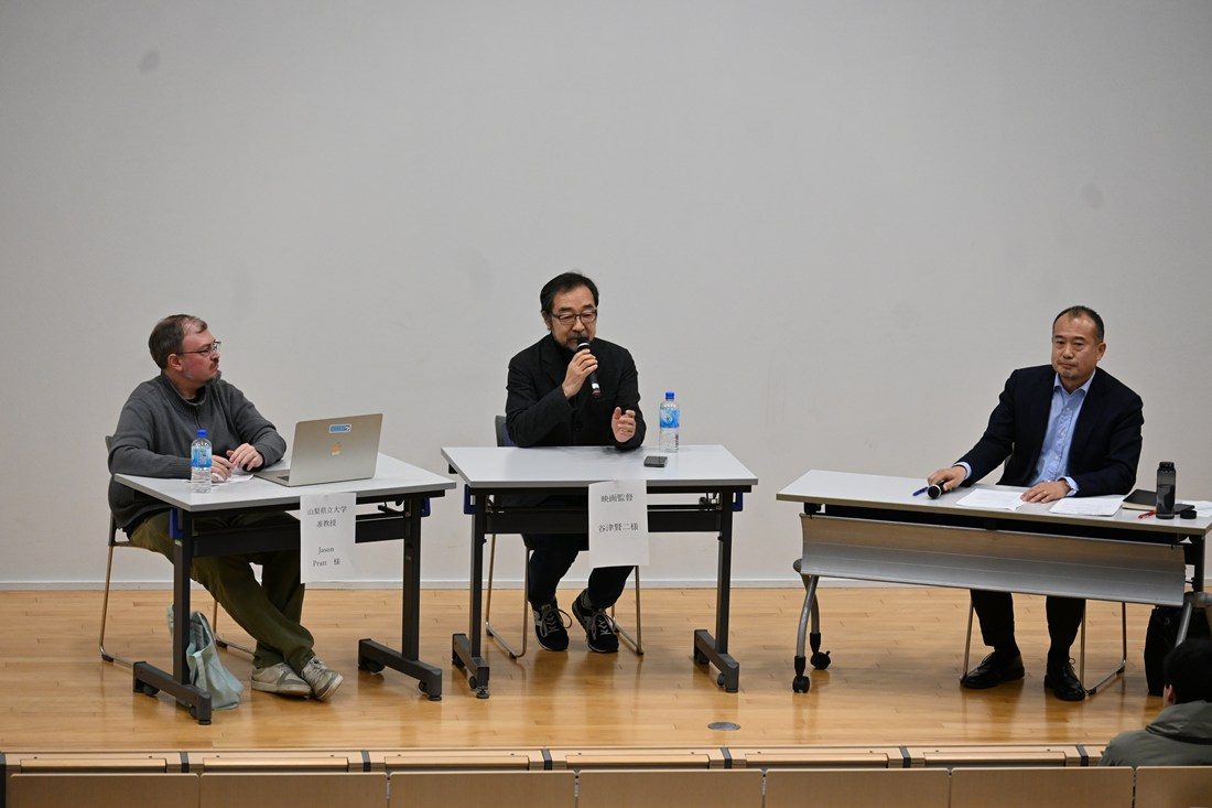 続いて映画を上映。数多の困難を乗り越えて65万人もの命を支えるインフラになっていく用水路を建設した中村医師の生きざまを20年以上にわたって追った谷津監督の作品に、参加者から大きな拍手が送られました。パネルディスカッションでは、政治経済学部の藤巻裕之教授が司会を務め、谷津監督と共に元・駐日アフガニスタン大使館広報官で山梨県立大学准教授のジェイソン・プラット氏も登壇。「没後6年・中村哲医師が今問いかけるもの」をテーマに、アフガニスタンをはじめとした国際情勢や社会の課題について意見を交わしました。