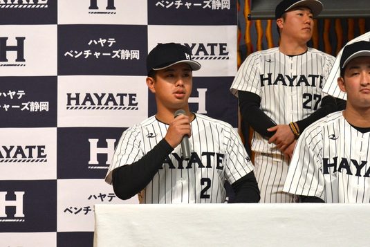 静岡キャンパス硬式野球部の德山俊選手(海洋学部4年次生)がこのほど、プロ野球ファーム・リーグ中地区のハヤテベンチャーズ静岡に入団しました。1月11日には静岡市内で、チーム主催の入団会見が開かれました。德山選手は、内野の全ポジションを守れるユーティリティ・インフィールダーです。打撃面では、2年次生時の静岡学生春季リーグ戦で首位打者を獲得するなど、広角に打ち分ける打撃を武器に活躍してきました。また、3年次生時の秋季リーグからは主将を務め、チームをまとめる役割も担ってきました。