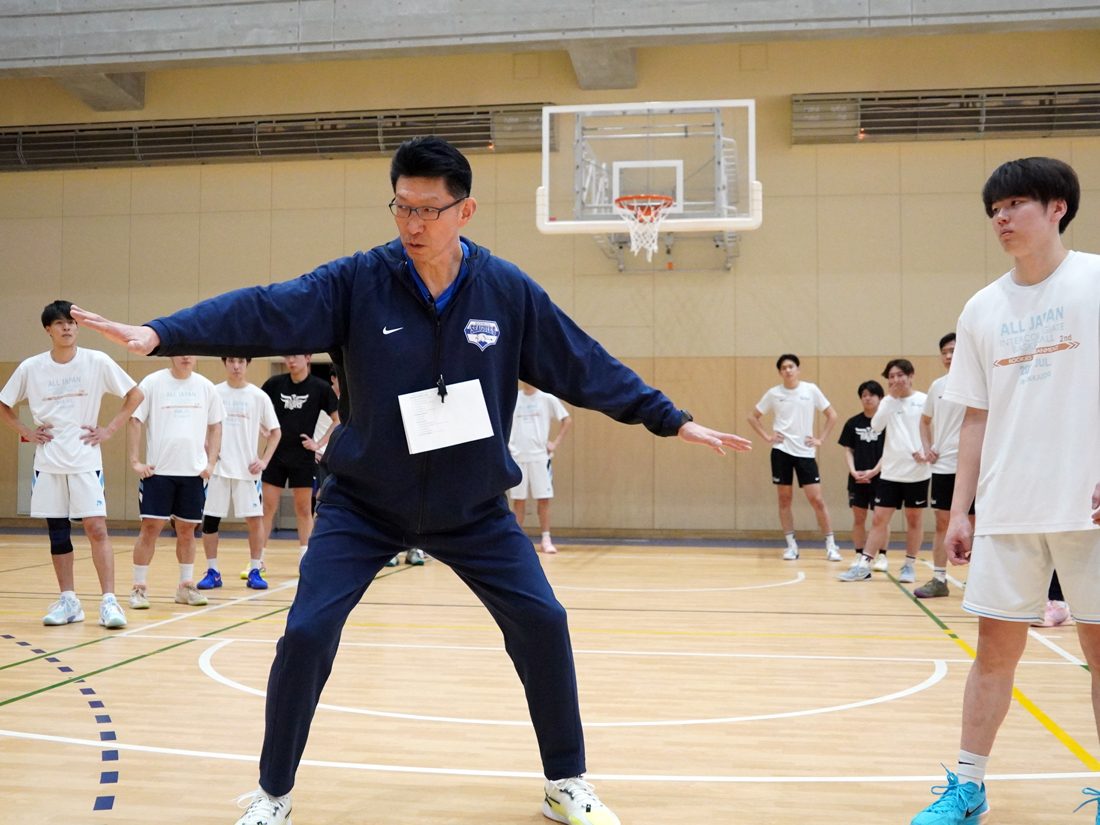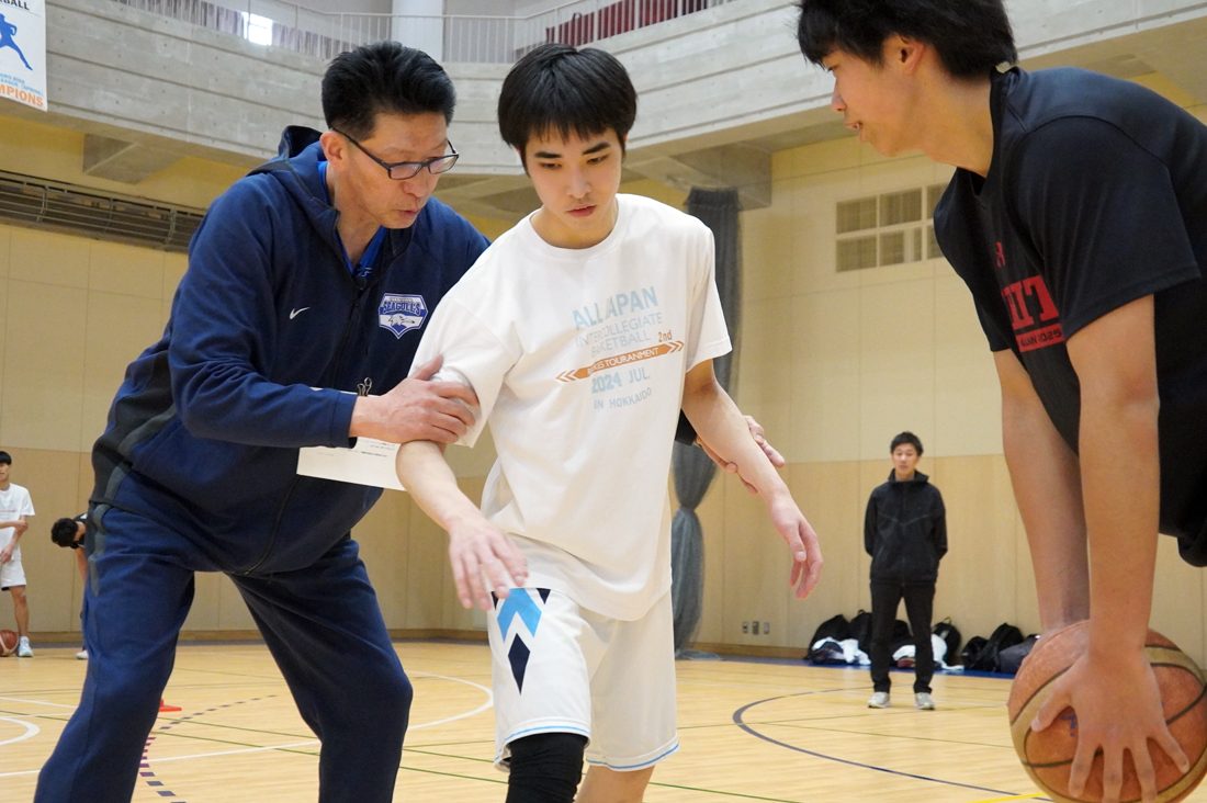初日は、北海道大学バスケットボール連盟選抜チームをモデルチームとした実技指導クリニックを実施。午前中はディフェンス・リバウンドとファンダメンタル、午後からはオフェンスのファンダメンタルを中心とした指導が行われ、陸川教授は選手の動きを見ながら「ナイス!」「OK! 今の動きはいいよ!」と随所でポジティブに声を掛け、聴講者には、「技術面を高める練習でもバスケットボールを楽しんでもらう指導が重要」と説明しました。モデルチームの一員を務めた札幌キャンパス男子バスケットボール部の北村峻平選手(国際文化学部地域創造学科3年次生)は、「関東のトップチームや欧米のクラブチームの事例を交えた先生の豊富な経験に基づく実技指導は非常に説得力がありました。バスケットボールを楽しむ姿勢を日々の練習に取り入れ、より強いチームづくりにつなげます」と語っていました。