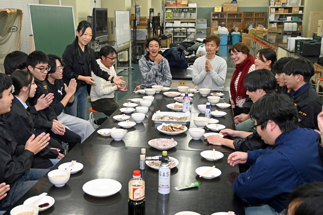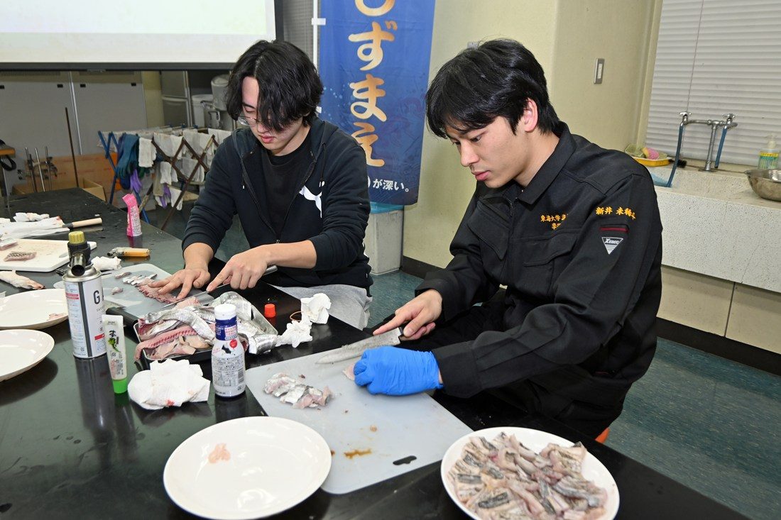 岡野幸樹さん(海洋学部3年次生)は、「アイスランドは漁業先進国と言われていますが、小規模漁業者は日本と同じ悩みを抱えていることを知れて興味を持ちました。よく獲れるタラのすり身をパンに塗って食べる文化があると聞いて驚きました」とコメント。谷本匠海さん(同)は、「岡野さんと一緒にレシピを考案しました。タチウオは骨が大きく、捌くのが難しい魚ですが、おいしく調理できてよかったです」と話していました。李准教授は、「学生と漁業関係者、チェンバース氏とともに、互いの文化を学び魚食文化も共有できました。チェンバース氏とは共同研究などで今後も交流を深めていく予定です」と語っていました。