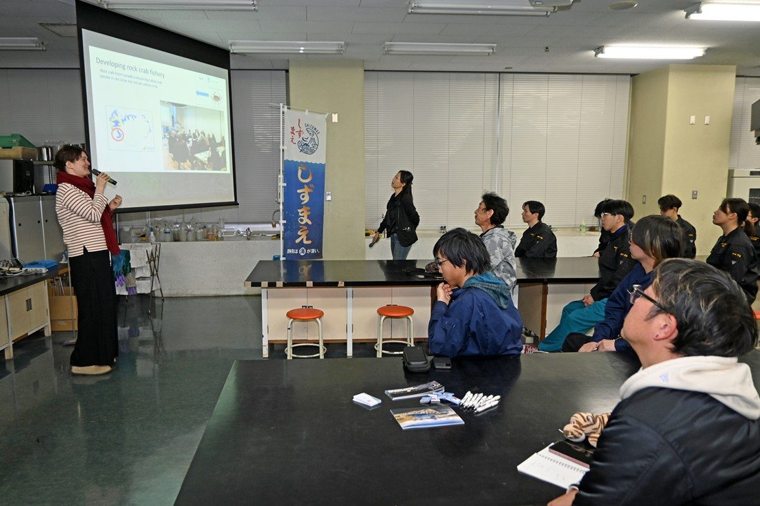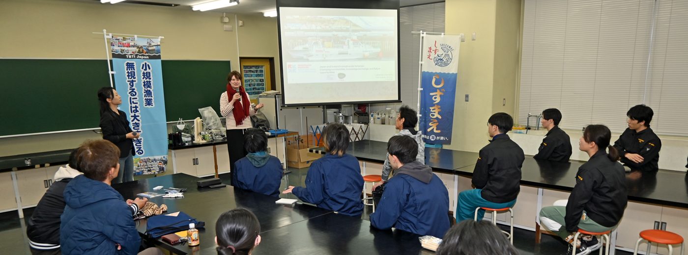 海洋学部水産学科の李銀姫准教授が2月5日に、静岡キャンパスで「北欧アイスランド水産業と魚食文化を学ぶ国際交流会」を開催しました。漁業管理や社会学などが専門の西部フィヨルド大学センター所長のキャサリン・チェンバース氏を講師に招き、アイスランドと日本における水産業や魚食文化について、両国の理解を深めようと李准教授が企画したもの。2部制で行われた当日は、李准教授の研究室の学生や地域の漁業関係者ら25名が参加しました。