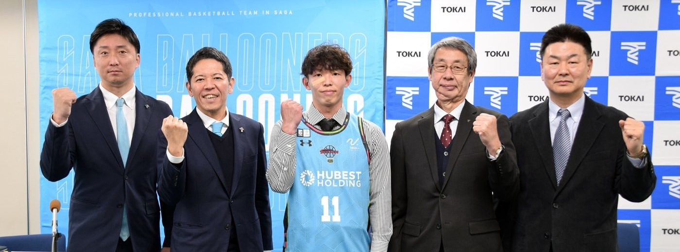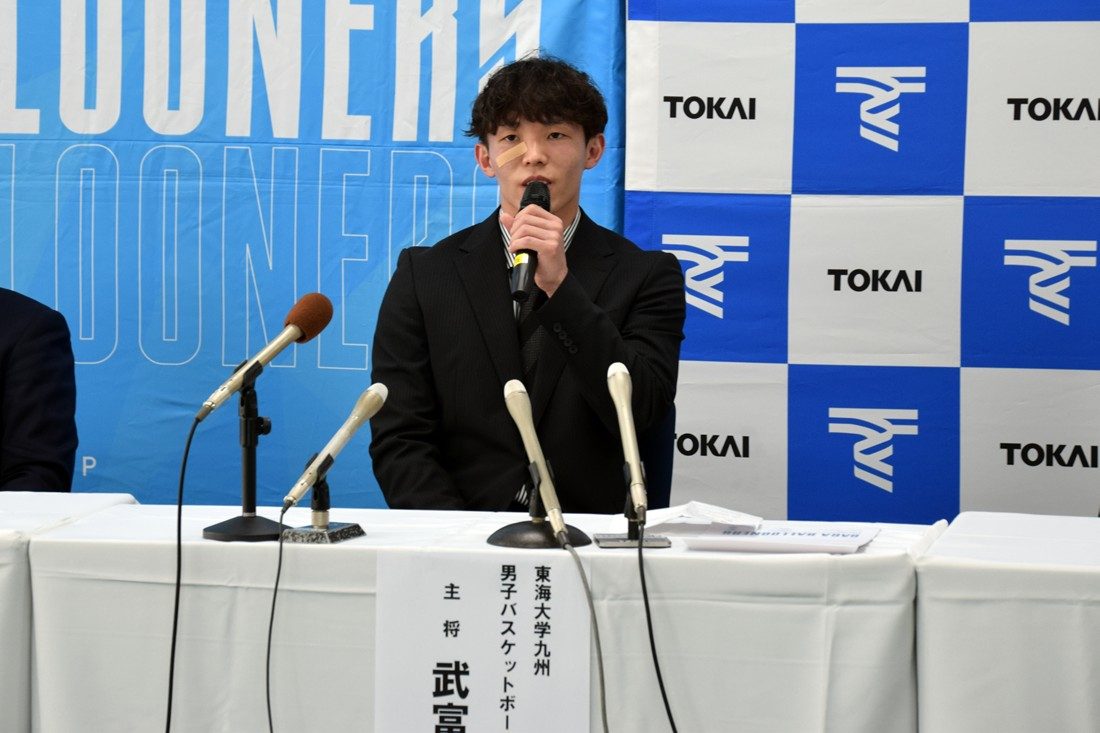 武富選手は、小学校2年生の時に父・浩二さんが指導するチームで競技を始め、「父が九州産業大学時代に元(ウォン)部長兼監督の指導を受けていたこともあり、勧められて東海大学に進学を決めました」と振り返ります。4年次生のときには主将を務め、西日本学生選手権大会と全九州大学リーグ戦での優勝に貢献し、両大会で最優秀選手賞とアシスト王の二冠に輝くなど、大学バスケ界屈指の司令塔として活躍してきました。記者会見に臨んだ武富選手は、「地元でプレーできることを大変うれしく感じています。元(ウォン)監督、石川真之コーチ(東海大職員)にたくさんのことを教えていただき、苦しいこと、うれしいことをチームメートと共に乗り越えて今があります。自分の強みであるスピードとパスを生かして勝利に貢献できるように頑張っていきます」とあいさつ。木之内副学長は、「文武両道を目標に掲げる本学で頑張ってきた成果を評価していただき、教職員一同、大変喜んでいます。彼の活躍は後輩たちの目標になります。大学で学んだことを胸に刻み、佐賀バルーナーズを優勝に導く活躍をしてほしい」と期待を寄せました。