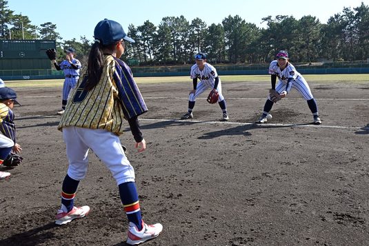 静岡キャンパスと静岡翔洋高の指揮官を兼任する弓桁義雄監督(付属静岡翔洋高校中等部教諭)は、「女子野球の裾野が広がり、本学も高校、大学に部活ができた今、その先で指導者になるという選択肢を考えるきっかけにしてほしいと思い企画しました。野球が好きで、野球を全力で楽しむのが女子選手の魅力であり、それを引き出すには女性の指導者が必要」と語ります。静岡キャンパスの鈴木はな主将(人文学部2年次生)は、「当日のメニューを考えたり、参加者を募ったりと、部員全員で準備をしてきました。小中学生に教えるのは初めてだったので、難しい言葉を使わないように心がけました。アドバイスがうまく伝わってできるようになったときはすごくうれしい。一つひとつ言葉にすることで、自分自身も普段何を考えてプレーしているのかを再認識する機会になりました」と話していました。