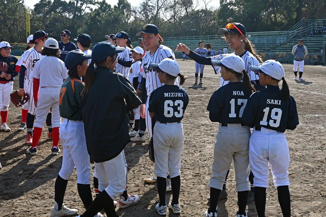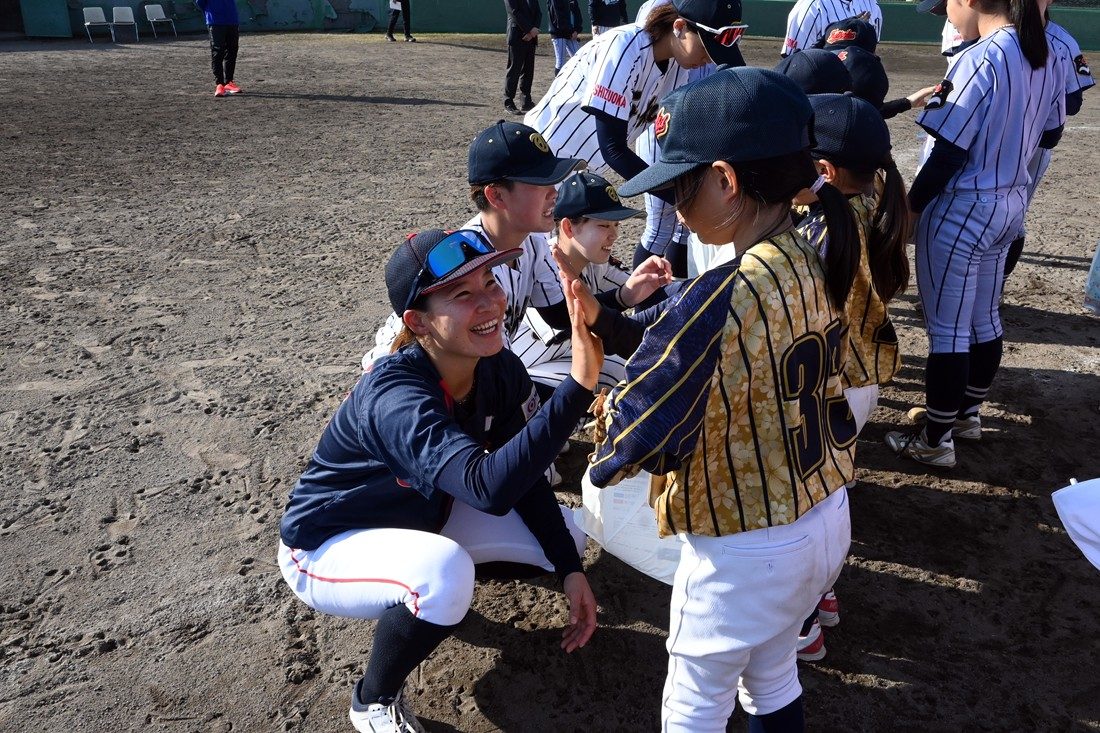 静岡キャンパスと静岡翔洋高の指揮官を兼任する弓桁義雄監督(付属静岡翔洋高校中等部教諭)は、「女子野球の裾野が広がり、本学も高校、大学に部活ができた今、その先で指導者になるという選択肢を考えるきっかけにしてほしいと思い企画しました。野球が好きで、野球を全力で楽しむのが女子選手の魅力であり、それを引き出すには女性の指導者が必要」と語ります。静岡キャンパスの鈴木はな主将(人文学部2年次生)は、「当日のメニューを考えたり、参加者を募ったりと、部員全員で準備をしてきました。小中学生に教えるのは初めてだったので、難しい言葉を使わないように心がけました。アドバイスがうまく伝わってできるようになったときはすごくうれしい。一つひとつ言葉にすることで、自分自身も普段何を考えてプレーしているのかを再認識する機会になりました」と話していました。