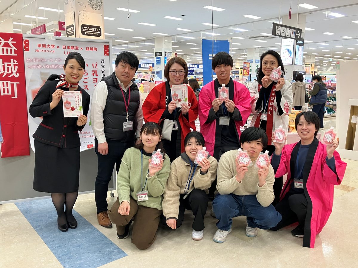 ※本プロジェクトは、熊本地震で甚大な被害を受けた益城町の復興支援などを目的に日本航空株式会社(JAL)と熊本県益城町、イオン九州株式会社とともに取り組んでいる「益城町特産品開発プロジェクト」の一環です。2022年には本学の「商品開発サークル」が協力した「凍らせて食べるすいかあいす」など4商品を販売。「豆乳ヨーグルトのスムージー(いちご)」は本プロジェクトの第4弾で、熊本県内での限定販売となっています(2026年2月1日時点:イオン熊本、イオン大津ショッピングプラザ、マックスバリュ新託麻店、マックスバリュCOCOSA)。