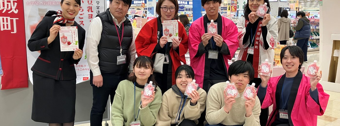 ※本プロジェクトは、熊本地震で甚大な被害を受けた益城町の復興支援などを目的に日本航空株式会社(JAL)と熊本県益城町、イオン九州株式会社とともに取り組んでいる「益城町特産品開発プロジェクト」の一環です。2022年には本学の「商品開発サークル」が協力した「凍らせて食べるすいかあいす」など4商品を販売。「豆乳ヨーグルトのスムージー(いちご)」は本プロジェクトの第4弾で、熊本県内での限定販売となっています(2026年2月1日時点:イオン熊本、イオン大津ショッピングプラザ、マックスバリュ新託麻店、マックスバリュCOCOSA)。