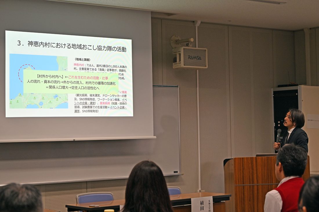 会では、基調報告として北海道科学大学未来デザイン学部助教の横山貴志氏が「地域おこし協力隊のこれまでとこれから―音威子府村の試みから―」として講演。研究報告では、乙部町地域おこし協力隊の小倉龍生氏、知内町地域おこし協力隊の大関太一氏がそれぞれの実践活動の様子を紹介しました。続いて本学北海道地域研究センター所員の植田俊准教授(国際文化学部地域創造学科)が「地域おこし協力隊活動にみるパブリックアチーブメントの意義」をテーマに登壇。北海道における地域振興と地域開発の現代的意義について言及し、札幌一極集中と地方の縮小社会化という現実への直面を指摘し、神恵内村を対象にした事例研究の成果を発表しました。「特に注目すべき点として、協力隊員の基礎づくり活動が重要。外部からの人材や資本を導入する前に、まず村内の活性化を図る取り組みとして、交通安全週間への参加、村民運動会への選手としての参加、神社の例大祭での神輿担ぎなど、地域の既存活動への積極的な参加を通じて信頼関係を構築したことが成功の要因となります」と語りました。