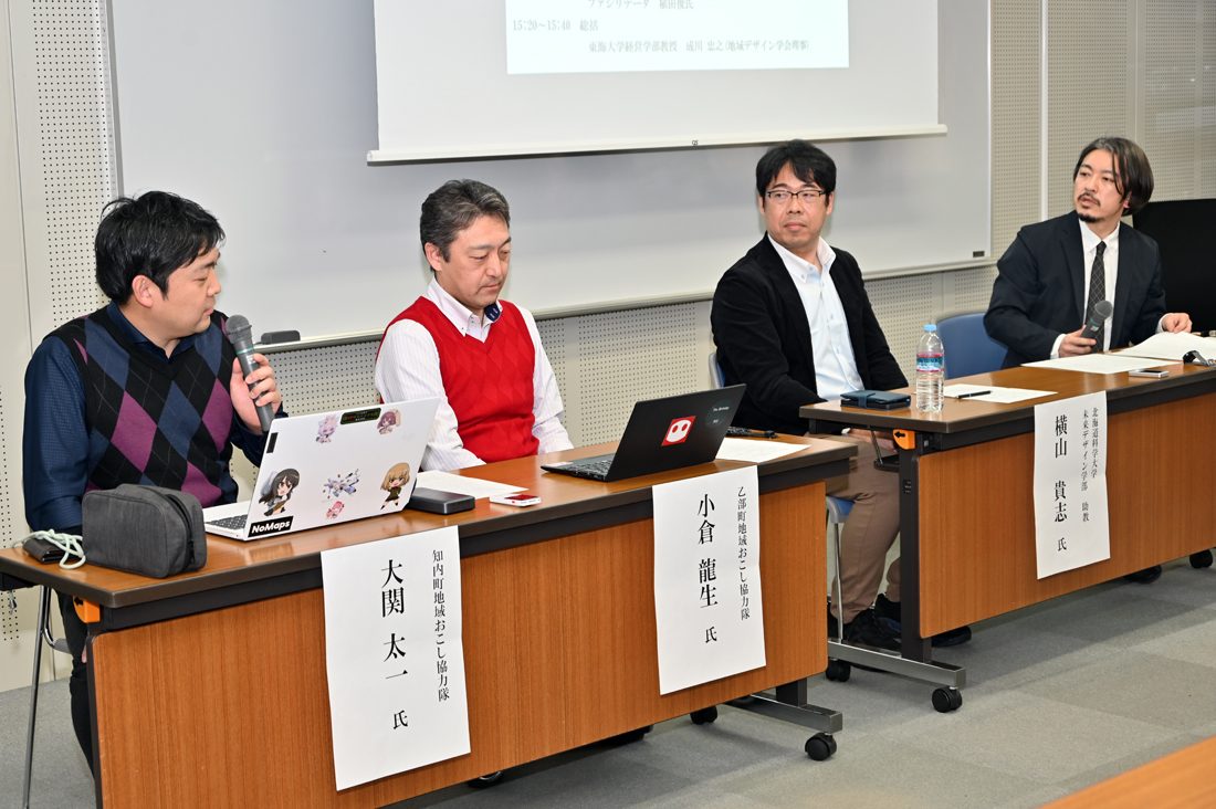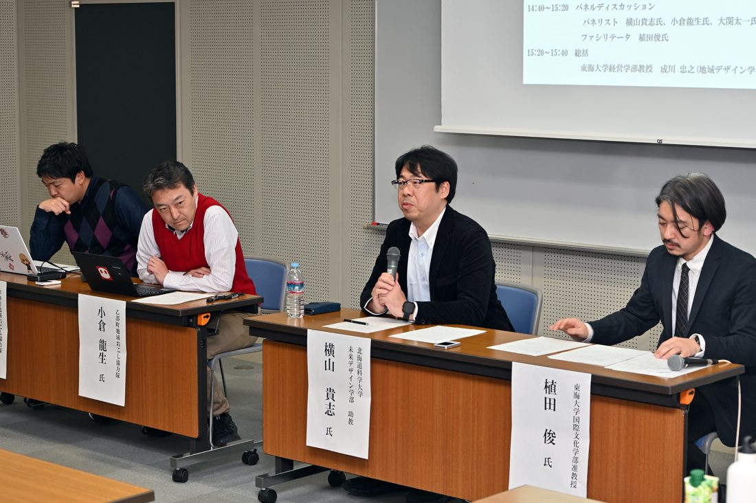 パネルディスカッションでは植田准教授がファシリテーターを務め、横山氏、小倉氏、大関氏が登壇し、会場から寄せられた質問に回答。地域への関わり方をめぐる考え方の違いや地域人材の確保と育成における行政の課題、協力隊の任期が原則3年であることを踏まえた活動の継続性について熱心な議論が交わされました。最後に、同学会理事である本学経営学部の成川忠之教授が総括し、地域デザイン学会が提唱する、ゾーン(Zone/地域・区切られた空間)、トポス(Topos/場所性・場の唯一無二性)、コンステレーション(Constelation/解釈枠組の提供)、アクターズ・ネットワーク(関係社会グループ)を組み合わせて、地域活性化の可能性を発見・発現させるフレームワークであるZTCAデザインモデルの観点から議論を整理しました。