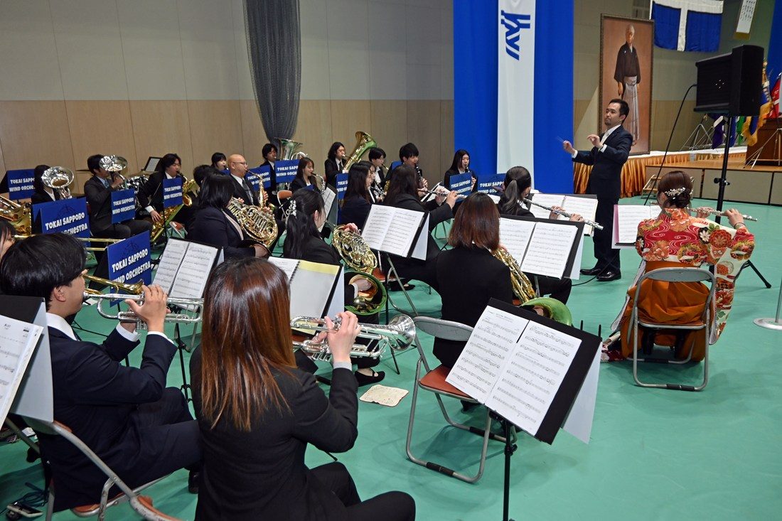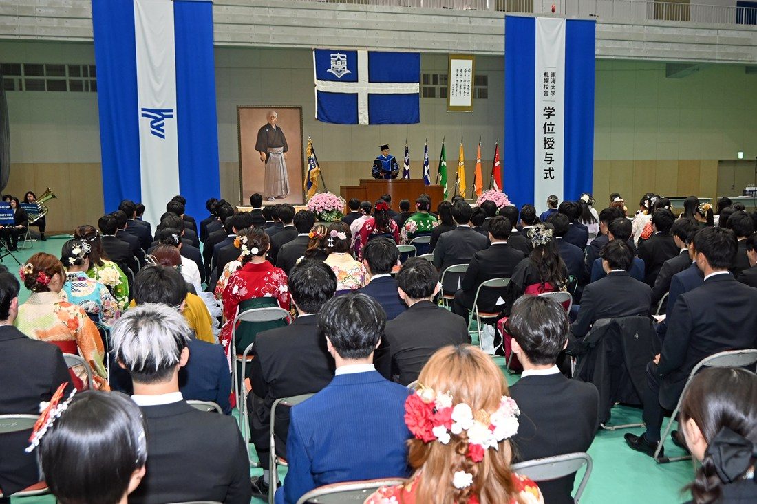 また、来賓を代表して東海大学同窓会北海道ブロックの本間雅実会長が祝辞を述べ、「卒業生の皆さんは新型コロナ禍が残る中、喜びや達成感を味わい、苦労や挫折を乗り越え、卒業を迎えられました。一昨年に亡くなられた松前達郎前総長は、常日頃から“社会での卒業生の活躍が学園の活力になる”とおっしゃられていました。全国の東海大学卒業生と絆でつながっている皆さんには無限の可能性があります。夢に向かって元気に羽ばたいてください」励ましました。校歌の斉唱に続き、平木隆之副学長(札幌キャンパス担当)が閉式の辞として、「本学で培った知識や経験と育んだ仲間との友情が、皆さんがこれから予期せぬ困難を乗り越え、夢や希望を叶えるための原動力になります。本学の教職員一同、皆さんの輝かしい未来を願っております」と語りました。