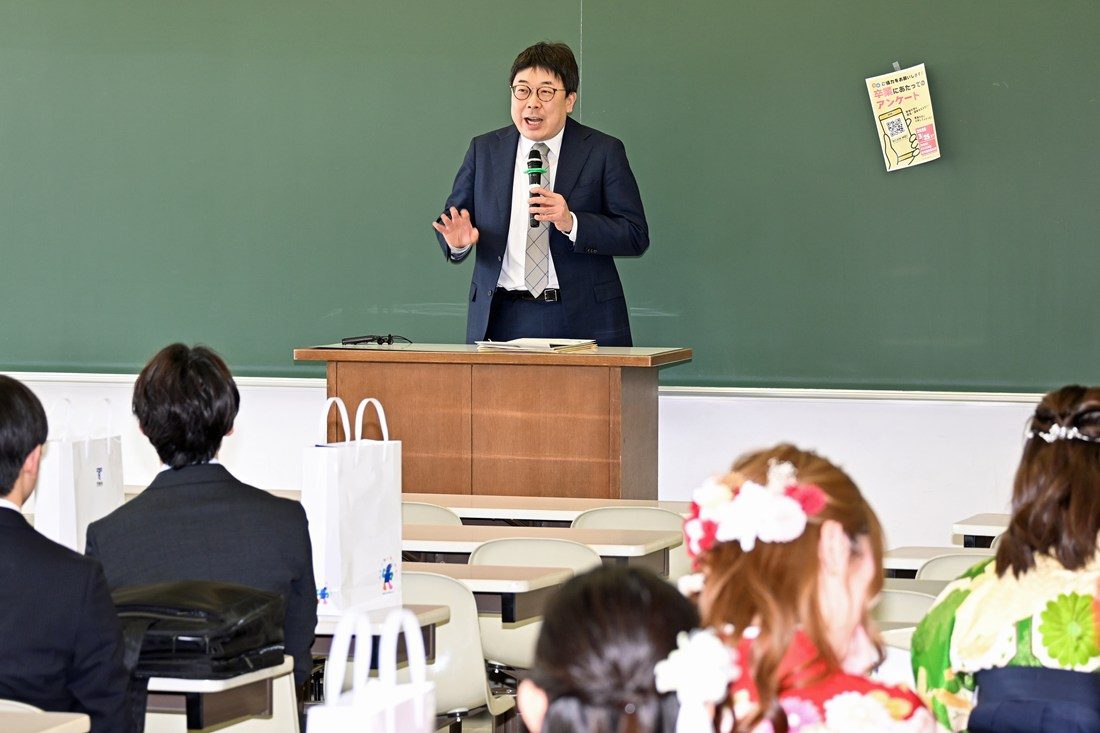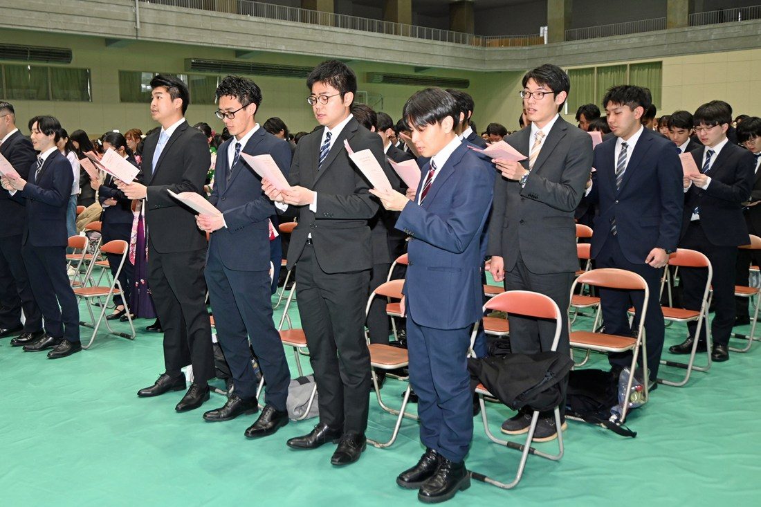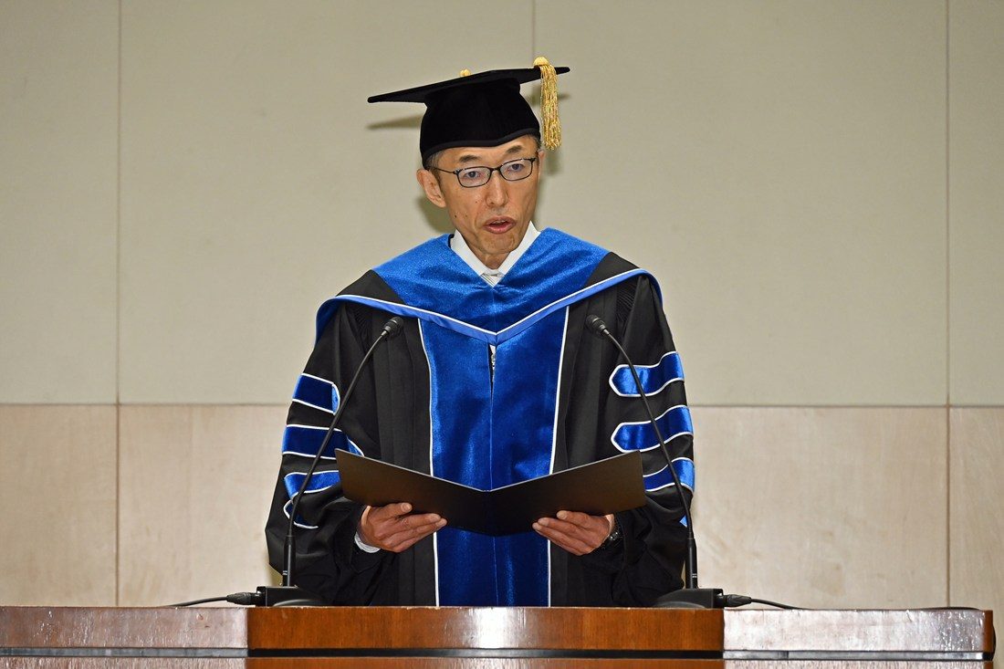 式辞では木村学長が学園の創立者・松前重義博士が掲げた「若き日に」から始まる「思想を培え」「体躯を養え」「知能を磨け」「希望を星につなげ」の4つの言葉を紹介し、「私は以前、柔道の山下泰裕先生(体育学部教授)と、パリダカールラリーで日本人初の優勝を果たした篠塚建次郎さんの対談で司会を務めました。その際、お二人から“日々の小さなチャレンジの積み重ねが、大きな希望につながる”という言葉をうかがいました。私自身も、小さな挑戦を積み重ね、積分した結果が成果につながると理解しています。長い人生から見れば、東海大学でのキャンパスライフは、あっという間だったかもしれません。しかし、ここで得た知識と経験、友人や先生方との出会いは、皆さんの人生を必ず豊かにしてくれます。人は一生学び続ける存在です。建学の精神を胸に、世界平和や温暖化による気候変動といった人類の課題に挑んでもらいたい」と語りかけました。