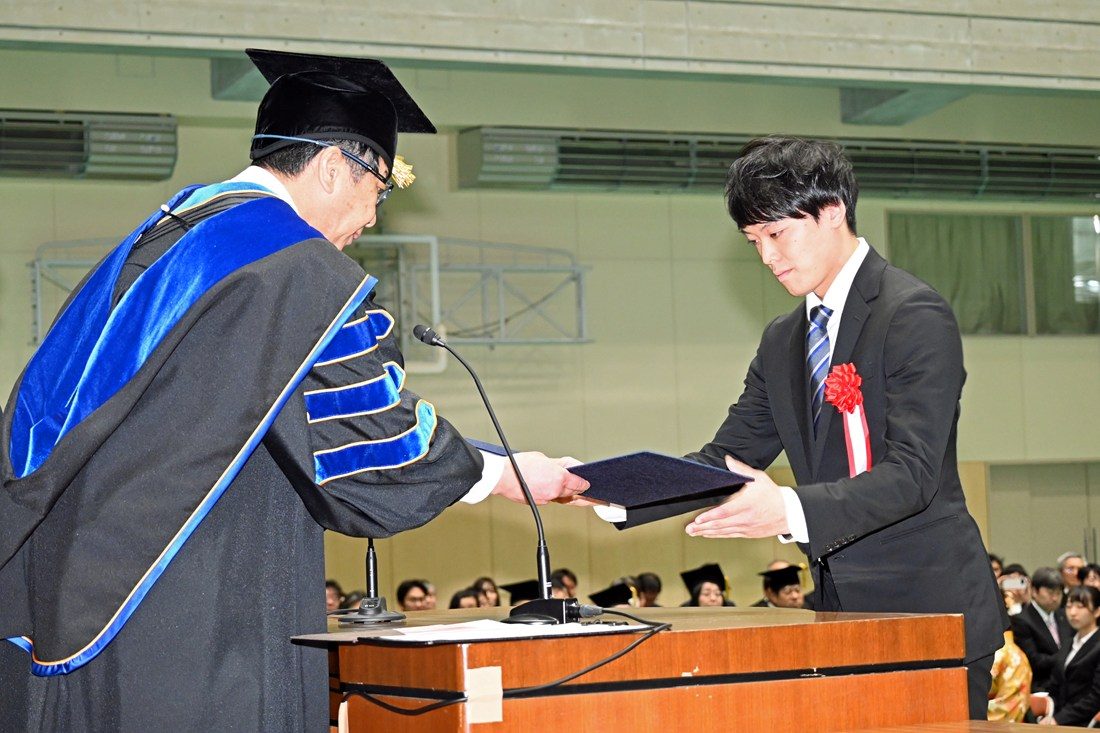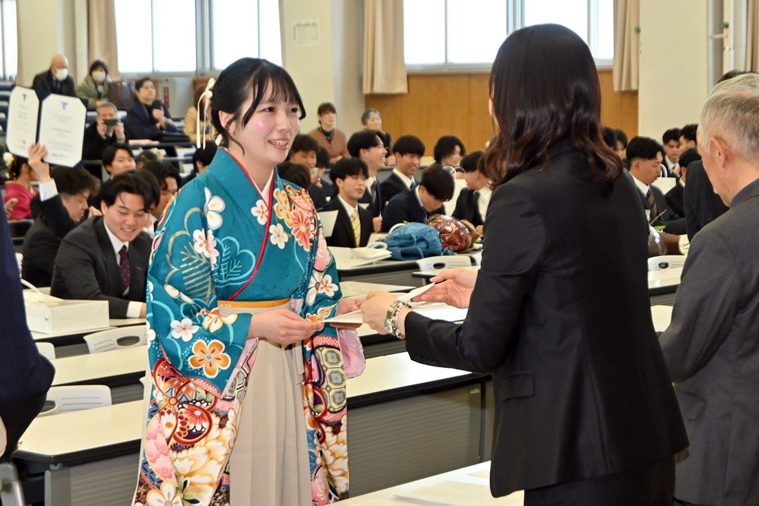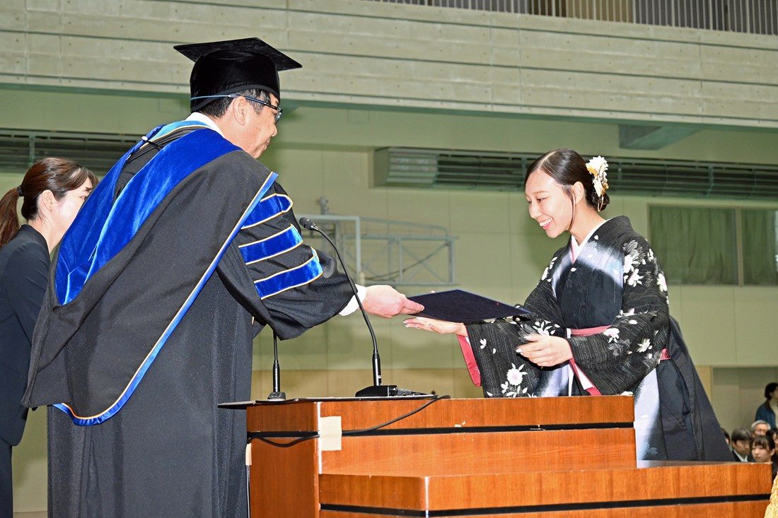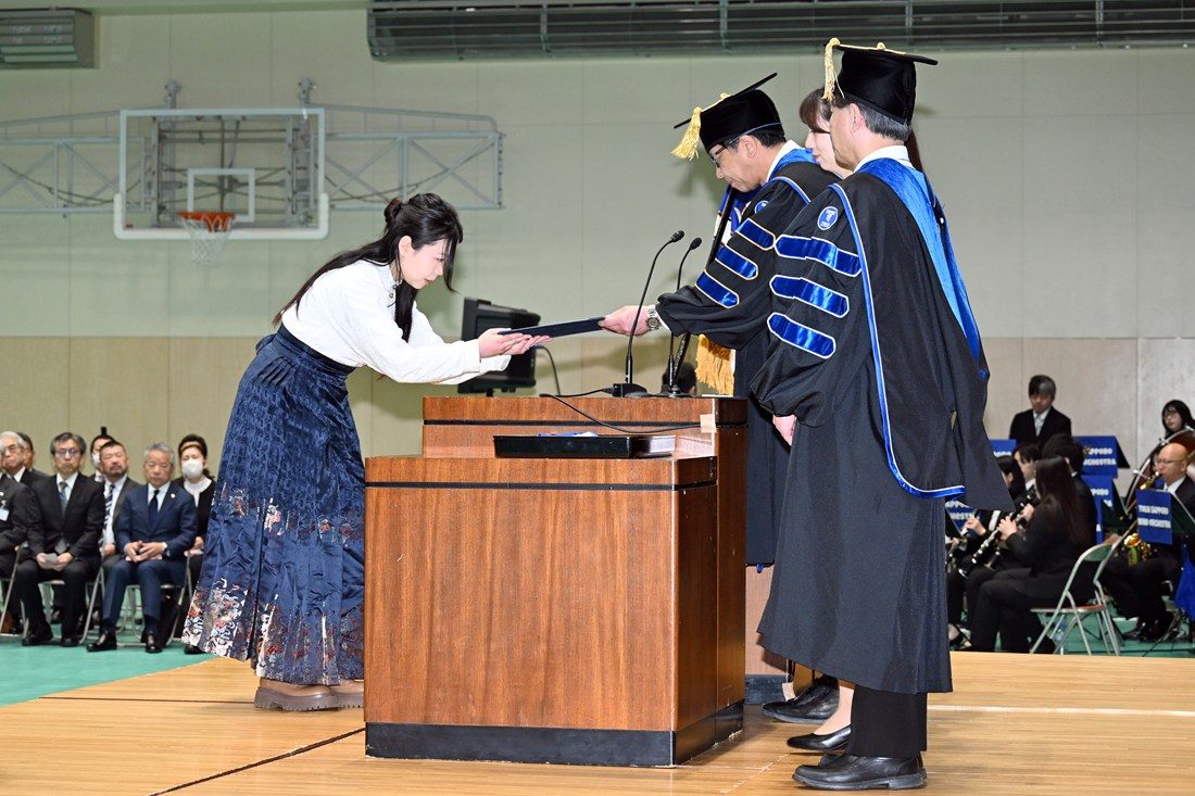 札幌キャンパスで3月21日に、2025年度秋学期学位授与式を挙行しました。今年度は大学院生物学研究科(修士課程)3名、国際文化学部167名、生物学部114名の計284名に学位記を授与しました。第一体育館(TOKAI ARENA)を会場に行った式では、吹奏楽部の演奏で『建学の歌』を斉唱。続いて、木村英樹学長が修士課程修了者に学位記を、大学院生物学研究科長の櫻井泉教授が記念メダルを贈り、学部卒業生の総代にも学位記を手渡しました。また、学業や課外活動で顕著な成績を収めた学生に総長賞など各賞を授与しました。