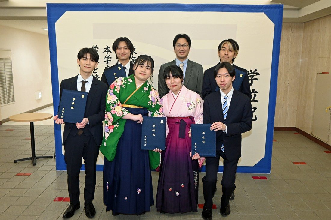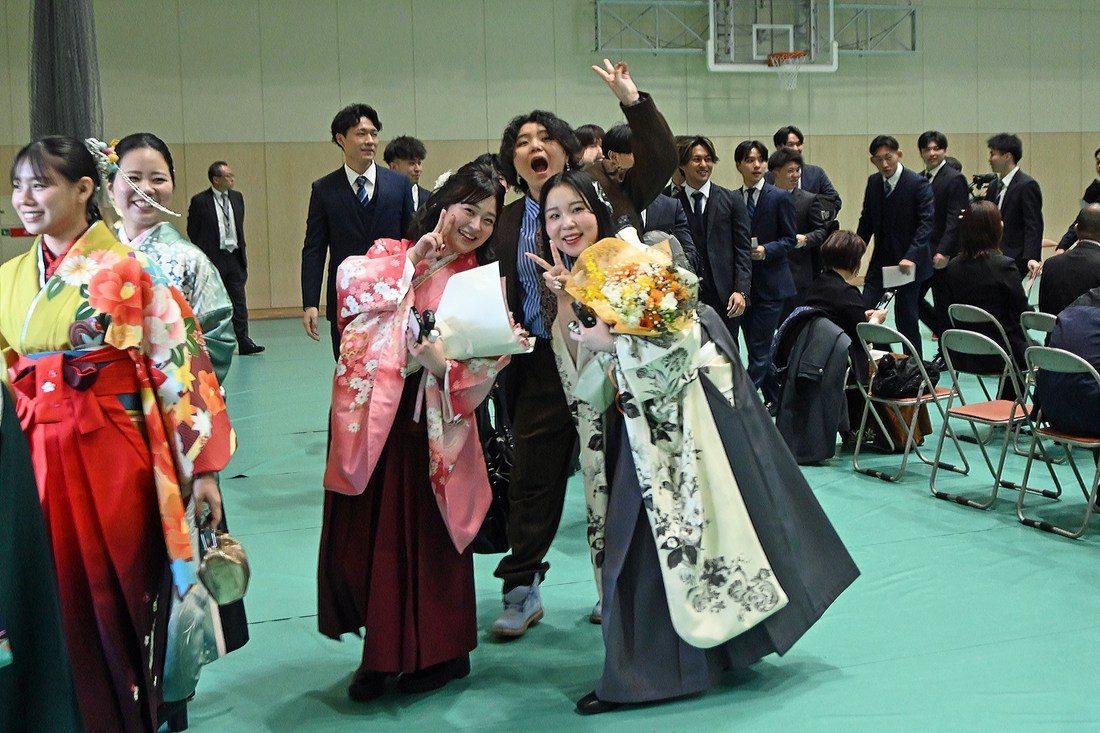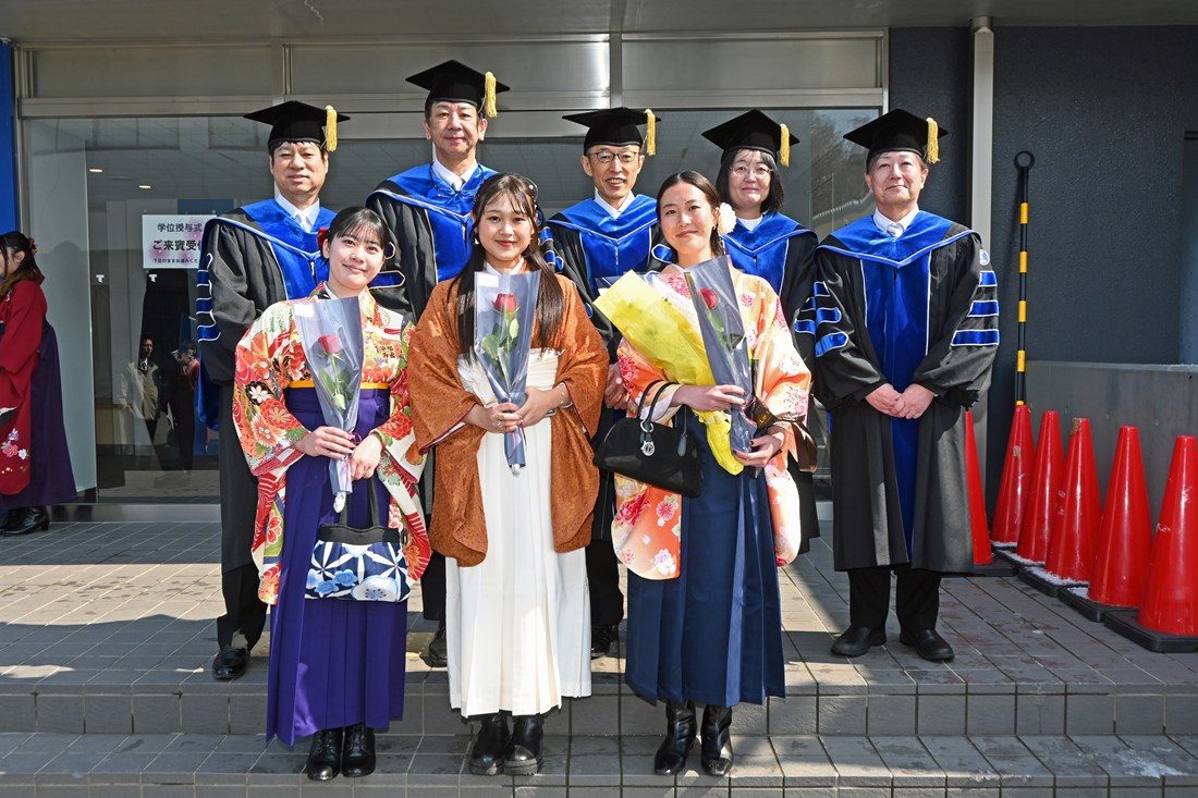 式典後には学科ごとに分かれて学生一人ひとりに学位記を授与。また、キャンパス内のメッセ入り口に設けたフォトスポットでは友人や恩師、保護者らと笑顔で写真を撮る姿が見られました。スキー・アルペンで全日本選手権や全日本学生選手権など数多の大会を制してきた渡邉愛蓮選手(国際文化学部)は、「大学ではたくさんの出会いがあり、いい仲間たちに恵まれて学業と部活動に専念できてきました。卒業後も競技を続け、ワールドカップ優勝やオリンピック出場を目指していきます」と話しました。またToCoチャレ「札幌ボランティアプロジェクト」のプロジェクトリーダーを務めた高橋拓輝さん(生物学部)は、「プロジェクトでは地域連携活動など充実した取り組みができました。また、卒業研究で指導教員の海藤晃弘教授に鍛えていただいたのもいい思い出です。東海大での4年間を通じて『集い力』『挑み力』『成し遂げ力』『自ら考える力』の4つの力を伸ばせたと実感しています」とコメント。札幌学生会で2023年度会長を務めた牧田遼樹さん(同)は、「学生会活動のほかにも海外研修航海で学生長を務めるなど東海大でしかできないいろいろなチャレンジがありました。社会に出てもこの経験を生かしていきたい」と話し、同じく25年度会長を務めた小松恵大さん(同)は、「大学で一番盛り上がる建学祭の運営にも携わることができて、楽しい日々を送ることができました」と充実した表情を見せていました。