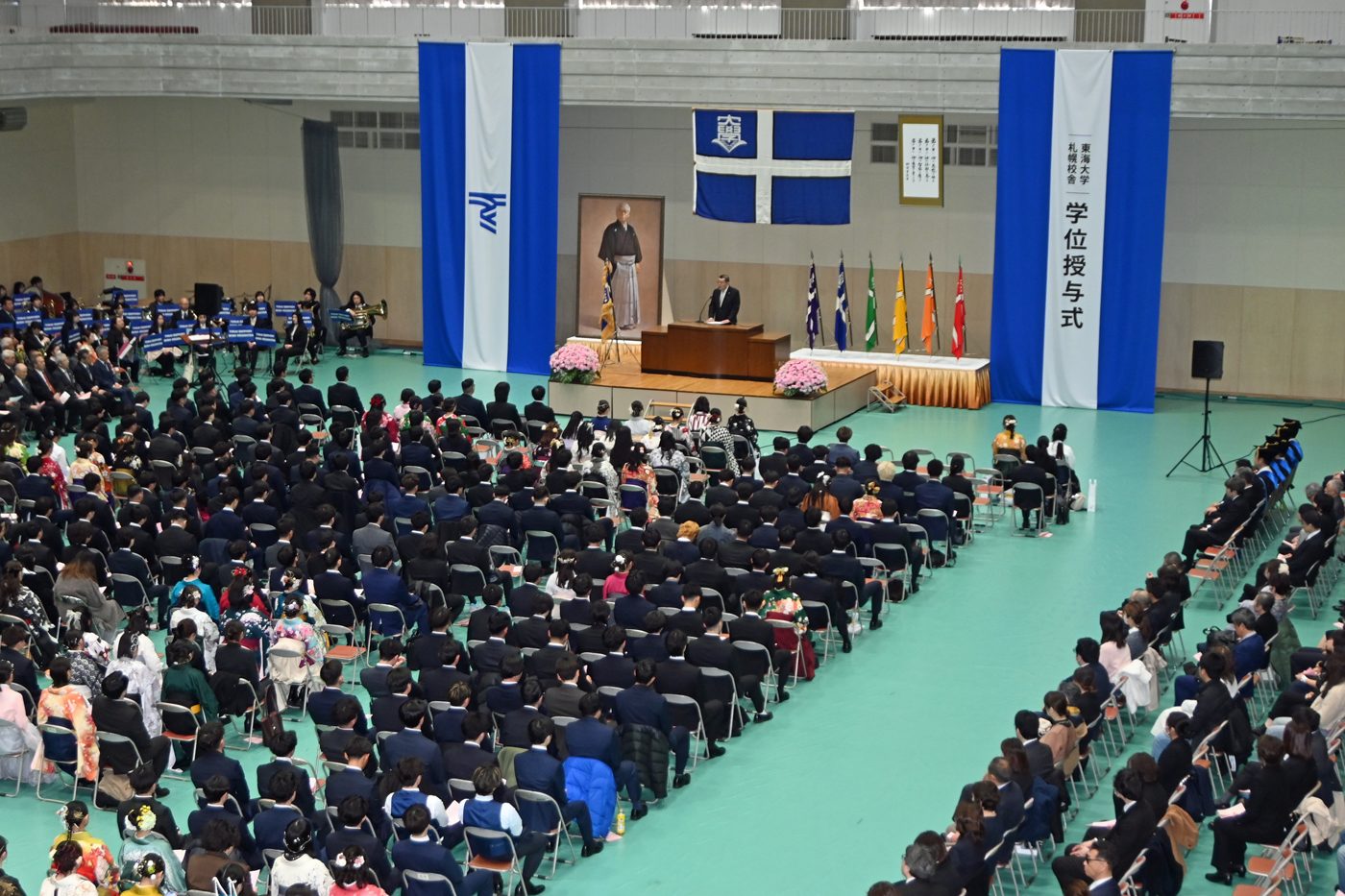 式辞では木村学長が学園の創立者・松前重義博士が掲げた「若き日に」から始まる「思想を培え」「体躯を養え」「知能を磨け」「希望を星につなげ」の4つの言葉を紹介し、「私は以前、柔道の山下泰裕先生(体育学部教授)と、パリダカールラリーで日本人初の優勝を果たした篠塚建次郎さんの対談で司会を務めました。その際、お二人から“日々の小さなチャレンジの積み重ねが、大きな希望につながる”という言葉をうかがいました。私自身も、小さな挑戦を積み重ね、積分した結果が成果につながると理解しています。長い人生から見れば、東海大学でのキャンパスライフは、あっという間だったかもしれません。しかし、ここで得た知識と経験、友人や先生方との出会いは、皆さんの人生を必ず豊かにしてくれます。人は一生学び続ける存在です。建学の精神を胸に、世界平和や温暖化による気候変動といった人類の課題に挑んでもらいたい」と語りかけました。