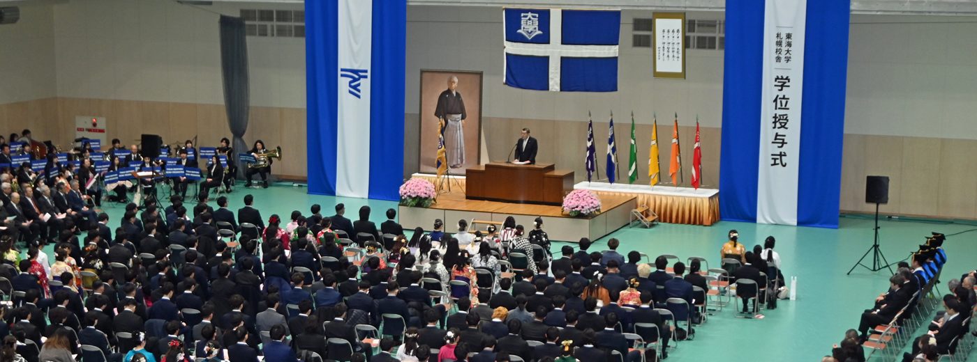 また、来賓を代表して東海大学同窓会北海道ブロックの本間雅実会長が祝辞を述べ、「卒業生の皆さんは新型コロナ禍が残る中、喜びや達成感を味わい、苦労や挫折を乗り越え、卒業を迎えられました。一昨年に亡くなられた松前達郎前総長は、常日頃から“社会での卒業生の活躍が学園の活力になる”とおっしゃられていました。全国の東海大学卒業生と絆でつながっている皆さんには無限の可能性があります。夢に向かって元気に羽ばたいてください」励ましました。校歌の斉唱に続き、平木隆之副学長(札幌キャンパス担当)が閉式の辞として、「本学で培った知識や経験と育んだ仲間との友情が、皆さんがこれから予期せぬ困難を乗り越え、夢や希望を叶えるための原動力になります。本学の教職員一同、皆さんの輝かしい未来を願っております」と語りました。