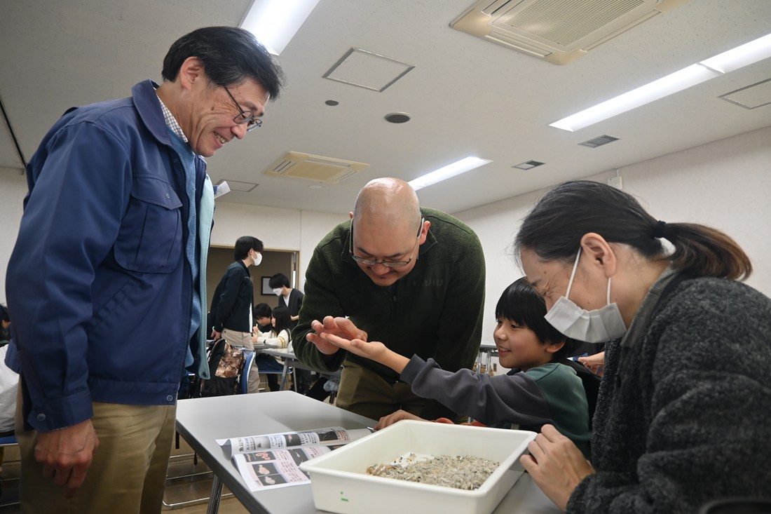 はじめに、水産学科の秋山信彦教授がシロウオを中心に、魚類が幼体から成体へと成長する過程について解説しました。続いて、同学科の髙見宗広講師が「ちりめんモンスターを探せ」をテーマに講演しました。イワシやサバ、タチウオなどさまざまな魚類の幼体をスライドで紹介した後、「皆さんもよく知っているチリメンジャコの中には、シラス以外にも魚類やエビ、カニなどの幼体が含まれています。それらは“ちりめんモンスター”と呼ばれています。今日はどんな生き物が見つかるか探してみましょう」と呼び掛けました。参加者にはバットいっぱいのチリメンジャコが配られ、学生もサポート役として加わる中、子どもたちはピンセットで丁寧により分けながらさまざまな生き物を探しました。