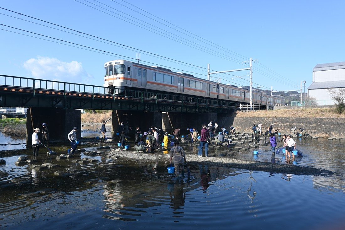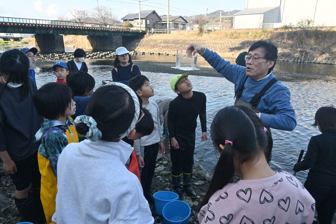 庵原川での観察では、参加者が秋山教授や学生とともに、たも網を使って遡上する生き物を採集しました。数多くのシロウオだけでなく、ボラやスズキなどの稚魚も見つかり、子どもたちは秋山教授の解説を聞きながら詳しく観察しました。参加した子どもたちは、「ちりめんモンスターを探す時間が特に楽しかった。おみやげにもらったチリメンジャコを家でも調べたい」「身近な川にたくさんの魚がいることを初めて知り、とても驚きました。また参加したい」と充実した表情を見せていました。秋山教授は、「今年は市内を流れる安倍川の瀬切れや興津川の河口閉塞の影響で庵原川への遡上が多くなった可能性があり、数多くのシロウオを子どもたちに見せることができました。晴天に恵まれ、日ごろできない体験をさせてあげられてよかった」と笑顔を見せていました。