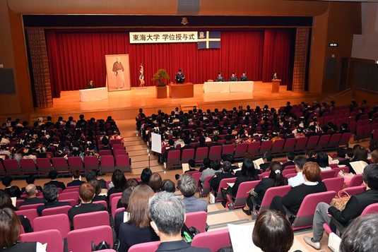 午前と午後の2回に分けて建学記念ホールで実施した式典では、木村英樹学長が博士課程と修士課程の修了者、各学科の総代に学位記を手渡しました。また、学業や課外活動で顕著な成績を収めた学生に総長賞など各賞を授与しました。式辞では、木村学長が学園の創立者・松前重義博士が掲げた「若き日に」から始まる「思想を培え」「体躯を養え」「知能を磨け」「希望を星につなげ」の4つの言葉を紹介し、「東海大学で得た知識や経験、友人や先生方との出会いは、皆さんの人生を必ず豊かにしてくれます。建学の精神を胸に、皆さんには、世界平和の維持や気候変動の抑止、エネルギー資源や食料生産の確保、災害から身を守る方法の確立といった人類の課題に挑み、幸福な社会の実現に貢献する人材に成長してほしい」とメッセージを送りました。祝辞では、東海大学同窓会静岡ブロックの葛本憲司会長(午前の部)と東海大学静岡県後援会の久保山昌利会長(午後の部)が登壇し、新生活を間近に控える学生たちにエールを送るとともに、保護者に向けて祝意を伝えました。
