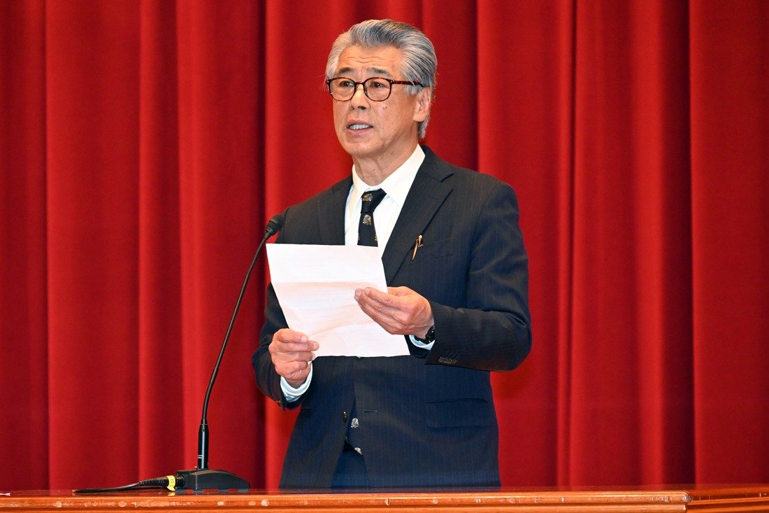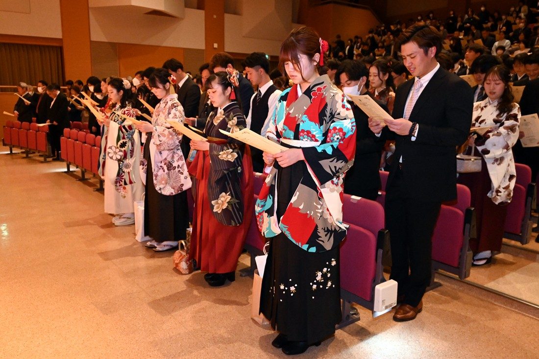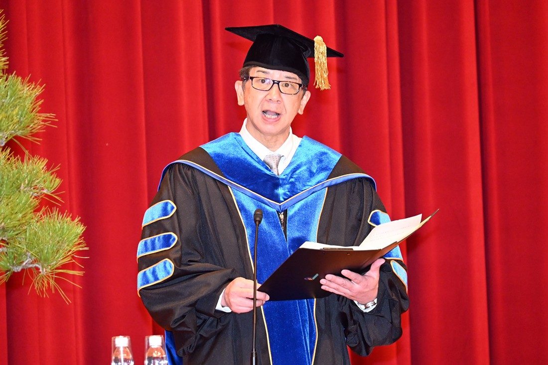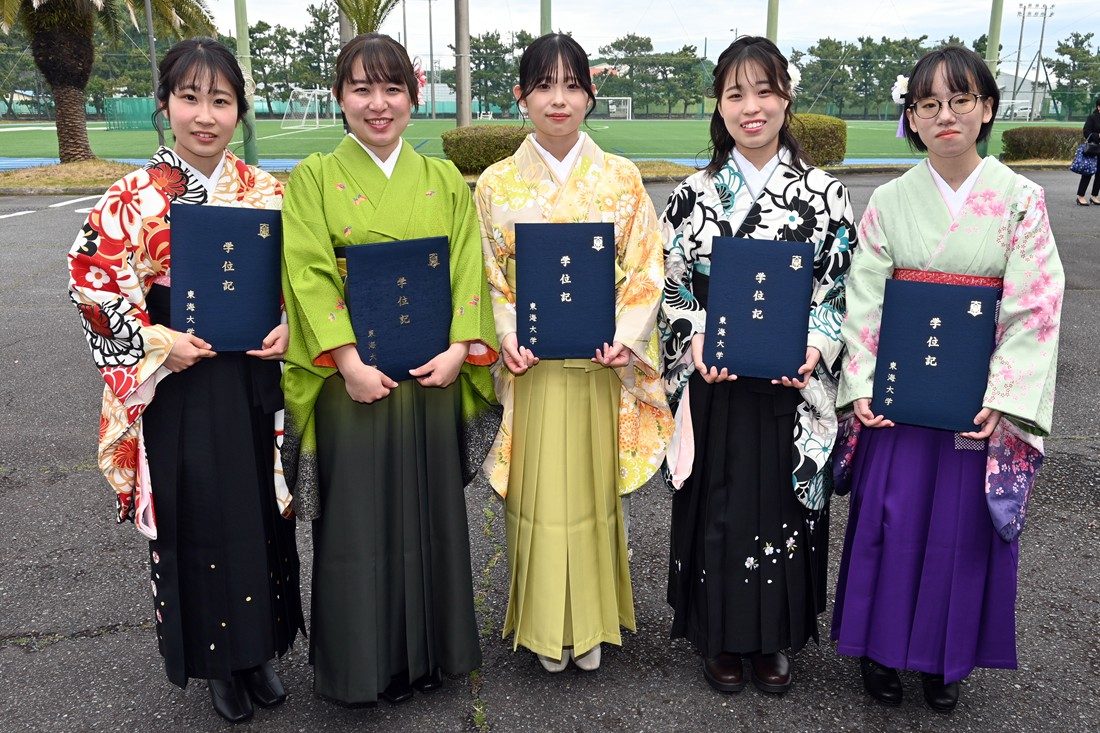 午前と午後の2回に分けて建学記念ホールで実施した式典では、木村英樹学長が博士課程と修士課程の修了者、各学科の総代に学位記を手渡しました。また、学業や課外活動で顕著な成績を収めた学生に総長賞など各賞を授与しました。式辞では、木村学長が学園の創立者・松前重義博士が掲げた「若き日に」から始まる「思想を培え」「体躯を養え」「知能を磨け」「希望を星につなげ」の4つの言葉を紹介し、「東海大学で得た知識や経験、友人や先生方との出会いは、皆さんの人生を必ず豊かにしてくれます。建学の精神を胸に、皆さんには、世界平和の維持や気候変動の抑止、エネルギー資源や食料生産の確保、災害から身を守る方法の確立といった人類の課題に挑み、幸福な社会の実現に貢献する人材に成長してほしい」とメッセージを送りました。祝辞では、東海大学同窓会静岡ブロックの葛本憲司会長(午前の部)と東海大学静岡県後援会の久保山昌利会長(午後の部)が登壇し、新生活を間近に控える学生たちにエールを送るとともに、保護者に向けて祝意を伝えました。