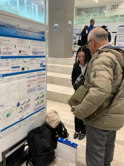 小峰さんは、「環境DNAを用いたエチゼンクラゲNemopilema nomuraiの出現把握」をテーマにポスター発表を行いました。傘径が1.2mにもなるエチゼンクラゲは、散発的に大量発生して漁業被害を引き起こします。本研究では、従来の目視やネット調査よりも簡便で高感度な環境DNA技術を用いた出現把握を目的としました。発表では、種特異的に検出可能なプライマー・プローブの開発、3つの水温条件における環境DNAの放出・分解速度の比較、東シナ海と日本海で実施した目視・ネット調査と環境DNA調査の結果比較の3点について紹介しました。