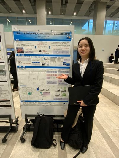 小峰さんは、「150件を超える発表の中で、自分の研究に興味を持ってもらう難しさを感じましたが、他分野の研究者の方々から多くのアドバイスをいただき、貴重なディスカッションの機会となりました。まさか受賞できるとは思っていませんでしたが、共同研究者の皆さまや日頃から温かくご指導いただいている西川淳先生のお力添えがあってこその結果です。今後も感謝を忘れず、よりおもしろい研究ができるよう精進します」と話しています。指導に当たる西川教授は、「乗船調査と室内実験を組み合わせ、試行錯誤を重ねながら進めてきた研究です。まだ課題は残されていますが、本人の努力が評価されたことを大変うれしく思います」と述べています。