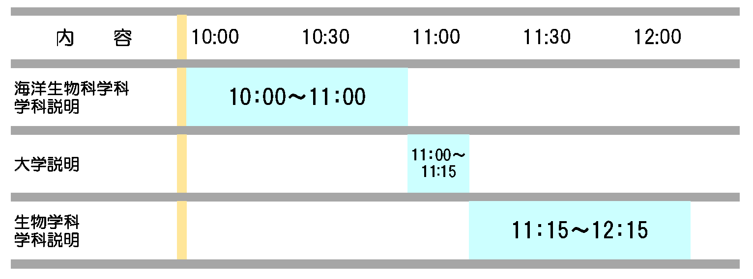 国際文化学部(地域創造学科、国際コミュニケーション学科)は、ハイブリッド型(来場・オンラインの同時開催)、生物学部(生物学科、海洋生物科学科)はオンライン型で実施いたします。