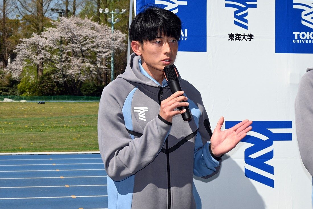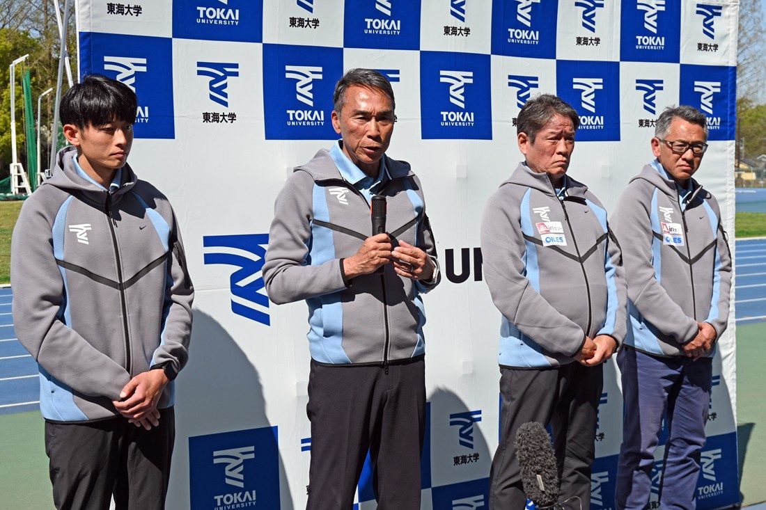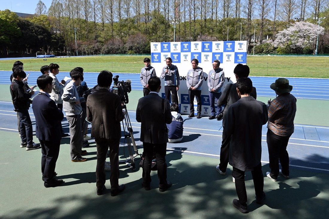 陸上競技部が4月8日に湘南キャンパスで、「2026年度新体制に関する記者説明会」を開催しました。陸上競技部は短距離ブロック、中長距離ブロック、跳躍ブロック、投てきブロックの4ブロックで構成され、大学日本一はもちろん、世界大会での好成績を目指して日々練習に励んでいます。26年度からは高野進部長(体育学部教授)のもと、短距離ブロックに佐藤拳太郎コーチ(体育学部特任助教・富士通)が新たに就任。中長距離ブロック・駅伝チームの両角速監督(スポーツプロモーションセンター教授)が陸上競技部総監督となり、後任として西出仁明ヘッドコーチ(同准教授)が監督を務めます。