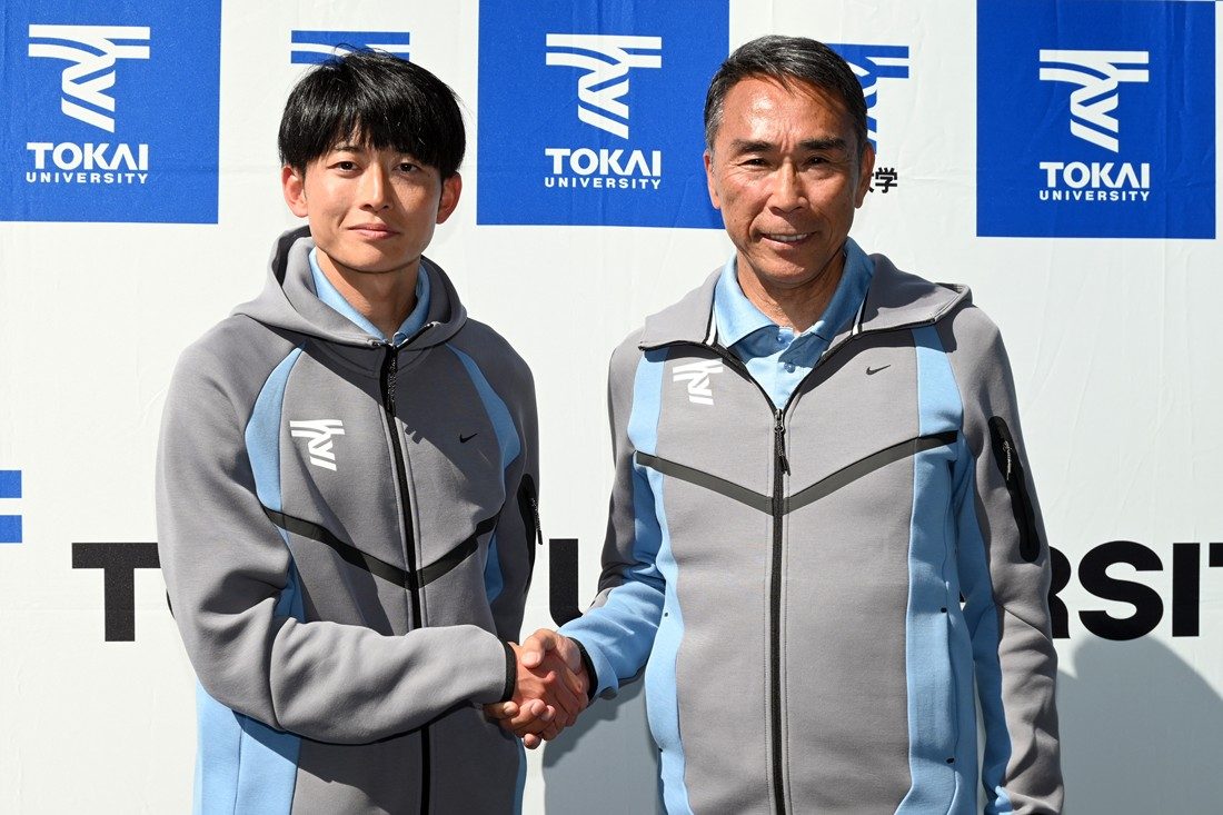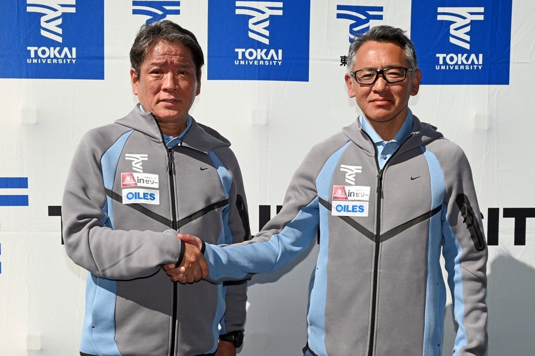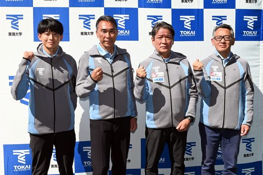 また、両角総監督は、「11年度に本学に着任し、学生三大駅伝の優勝をはじめ、多くの成果を挙げてきましたが、近年は思うような結果が残せていませんでした。チームの勝利のためには育成だけでなく、スカウティングにも力を注ぐ必要があります。中長距離ブロック・駅伝チームの指導は西出新監督に託し、私は部全体を統括しながら全国の高校生に本学の魅力を伝え、母校の勝利に貢献したい」と抱負を述べました。後任の西出監督は、「両角総監督が15年掲げてきた“人間力の向上なくして競技力の向上なし”というチームの柱は今後も変わりません。そこにスポーツ科学やウエートトレーニングの知見を加え、箱根駅伝で総合優勝した当時の“スピードの東海”を取り戻したい。まずは箱根駅伝でのシード権獲得を目指し、一人でも多くの選手に“東海大で走りたい”“東海大に来てよかった”と感じてもらえるよう、全力で取り組みます」と力強く語りました。