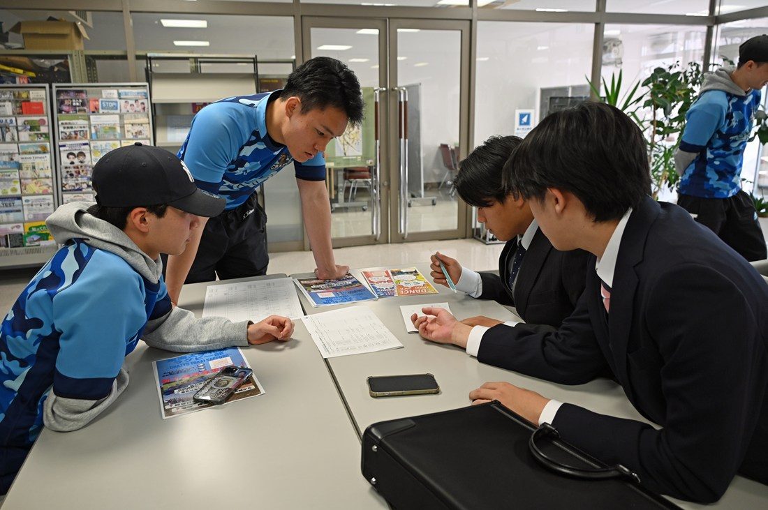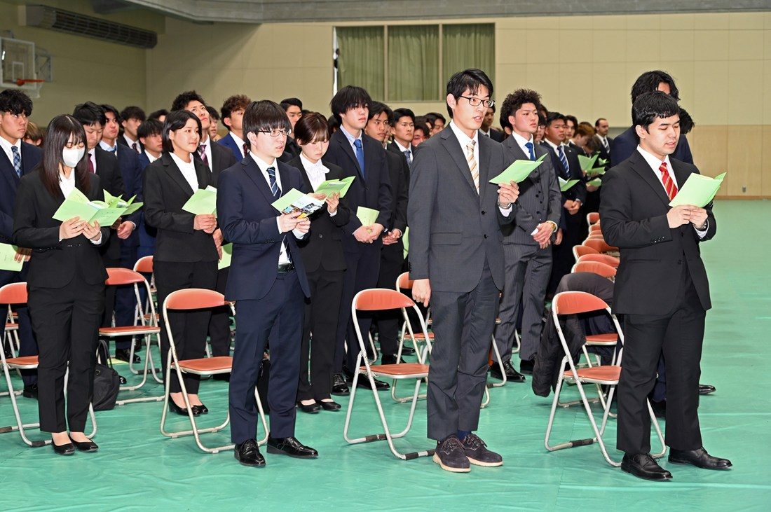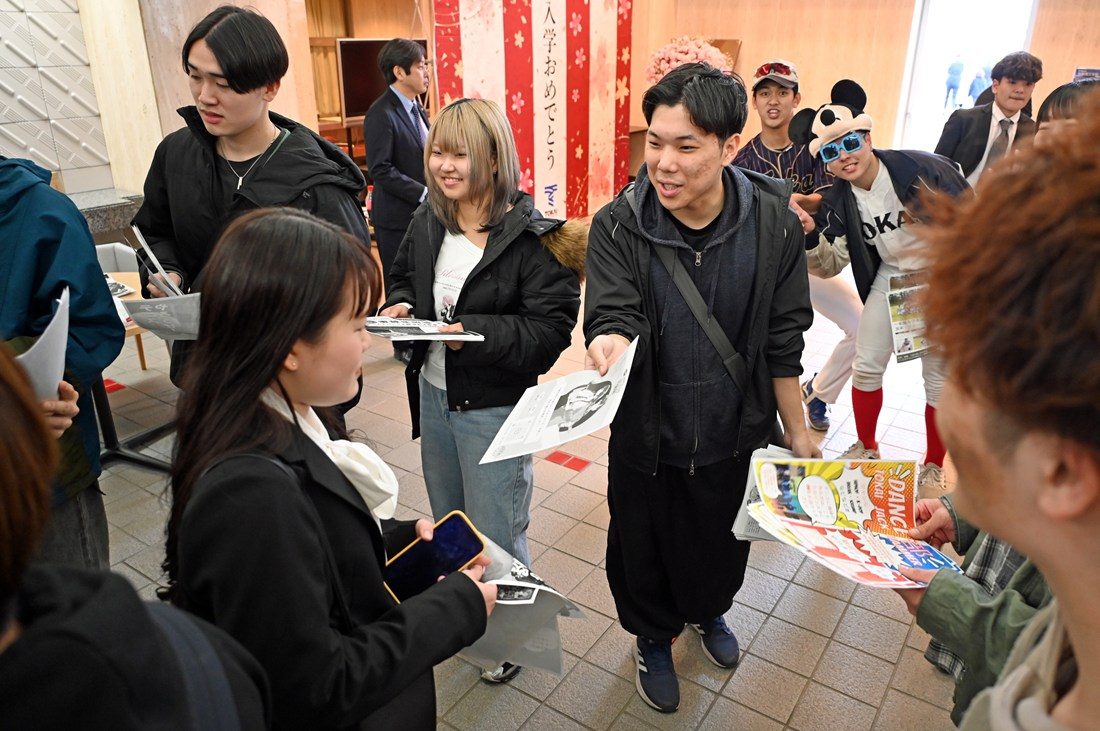 式典後には、学科別のガイダンスや部活動・サークル、ToCoチャレのプロジェクトに所属する先輩たちによるビラ配りなど勧誘活動も行われ、新入生たちは新生活のスタートに目を輝かせていました。新入生たちは、「4年間の部活動でどれだけ自分の力を高められるか楽しみです」「大学は高校までとは学びのシステムが違い不安もありますが、単位をしっかりとって課外活動もしっかり取り組んでいきたい」「スキーやスノーボードなど北海道の環境を生かしたウインタースポーツの授業が楽しみです。教職を志望しているので、なりたい将来をつかめるよう勉強も頑張ります」と目を輝かせていました。
