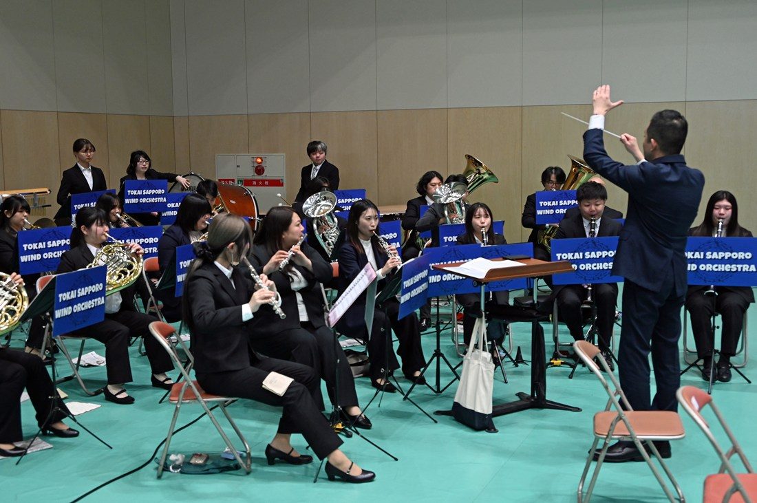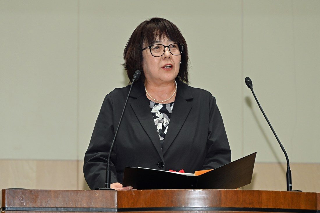 祝辞では、東海大学札幌地区後援会の丹羽かおり会長と、在学生を代表して札幌キャンパス学生会の木庭実優会長(生物学部海洋生物科学科4年次生)が登壇。丹羽会長は、「東海大学は専門分野を極められる場所です。学生生活における出会いが皆さんを成長させてくれるでしょう。受け身ではなく、何事にも自ら積極的に取り組んでください」とエール。木庭会長は、「大学生活をよりよくするために、まず友達を作りましょう。初めの“よろしく”の一言で4年間の相棒ができるかもしれません。計画的な単位取得も重要です。さらに、外に出ることを心がけましょう。せっかく北海道で大学生活を送るのですから、その魅力を堪能してください。キャンパスに新しく建った3号館にも足を運んでみてください。1年次生はまだ実験などの授業はありませんが、実験、研究に取り組む先輩たちのかっこいい姿を見ることができるはずです」とアドバイスしました。校歌斉唱の後、閉式にあたり平木隆之副学長(札幌キャンパス担当)が登壇。「アジア出身者で初めてノーベル経済学賞を受賞したインド出身の経済学者であるアマルティア・セン博士にならいますと、大学で学ぶ目的は人生の可能性を広げることであると言えます。大学でしか得られない力を蓄えることは、これから直面するかもしれない時代の変化、環境の変化に適応するための潜在力となり得ます。大学は“大きく学ぶ”と書きます。東海大学は大規模総合大学として皆さんが大きく学ぶためのユニークな学習機会を提供しています。皆さんが、チャンスを生かし人生における選択肢を増やしていただくことを願っています」と語りかけました。