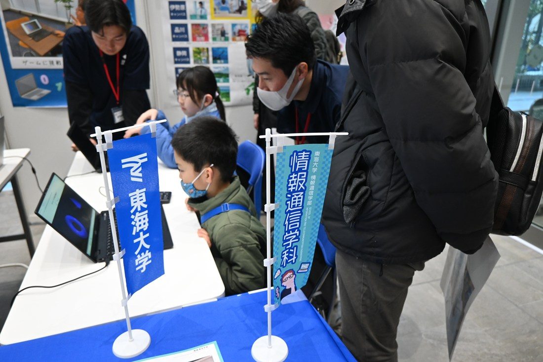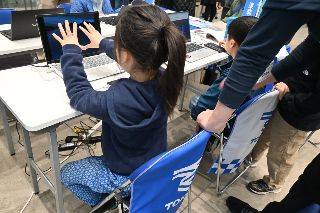 イベントには2日間で4200名を超える来場者があり、本キャンパスのブースにも途切れることなく親子連れなどが訪れました。学生たちは、コントローラーの上で手や指を動かして、パソコン画面に表示されたものを動かしたりつかんだりするゲームなどを紹介。子どもたちは真剣な表情でパソコンに向かい、背後では保護者が「惜しい!」「もう少し右」などと声をかけながら見守る様子が見られました。保護者からは、「スマホでゲームをすることはありますが、パソコンで遊ぶのは初めて。いい機会になりました」「ゲームでパソコンが身近に感じられました」などの声が聞かれました。