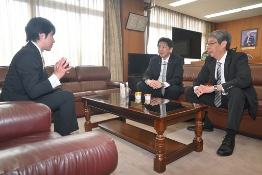 熊本キャンパスで4月4日、本学発ベンチャー・プロバイオの代表取締役を務める中島勇貴さんが木村英樹学長、木之内均副学長と懇談しました。