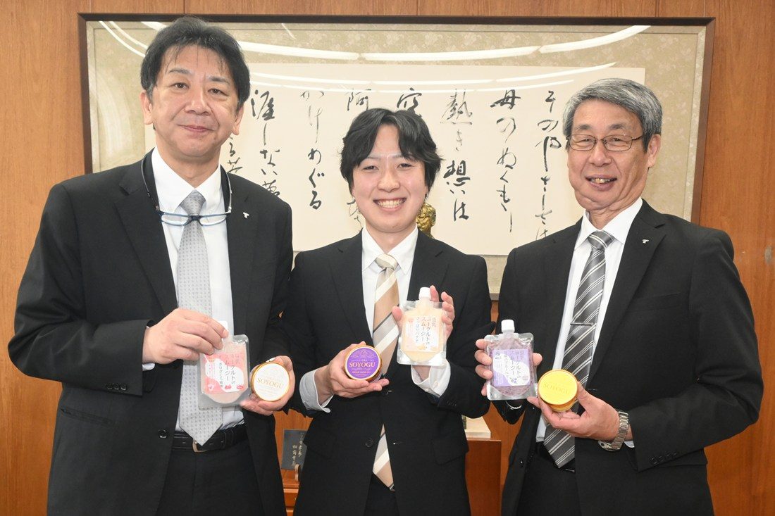 木村学長、木之内副学長との懇談では、商品開発の経緯や研究の進捗、製品の特長などを紹介。「豆乳ヨーグルト(発酵豆乳)に関する研究ではこれまで、抗酸化作用や終末糖化産物(AGEs)生成抑制作用、腸内細菌叢の改善効果、抗炎症作用などを見出してきました。次の展開としては、乳酸菌を使った商品の特定保健用食品承認取得を目指しています。社会的な信用を高め、さらなる研究の充実、商品開発につなげていきます」と語り、木村学長と木之内副学長は、「本学発ベンチャーとしての活躍を心強く感じています。本学では湘南キャンパスの健康学部や今年度に設立したウェルビーイング研究所、伊勢原キャンパスの医学部などで医療、健康に関する研究を積極的に展開しており、プロバイオとのさらなる連携も期待できます。全国に向けて商品の魅力を発信し、大きく成長してもらいたい」と話していました。