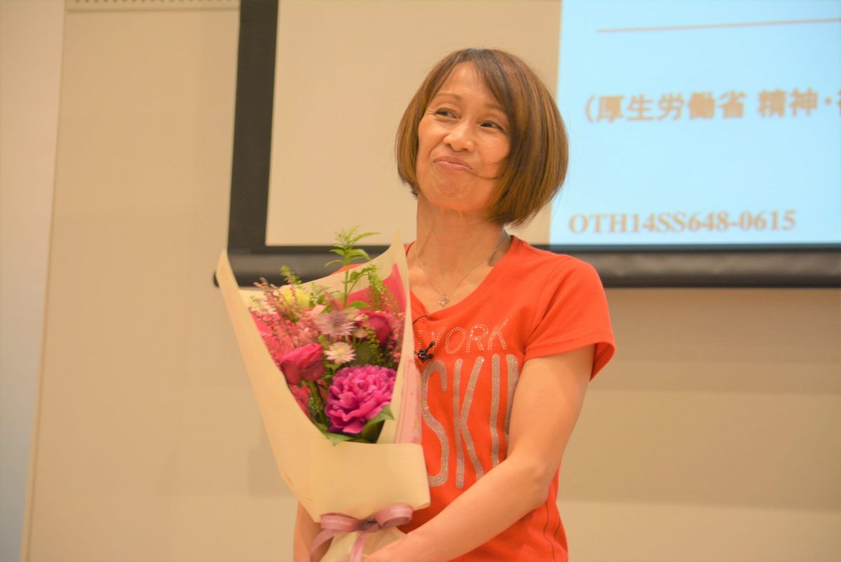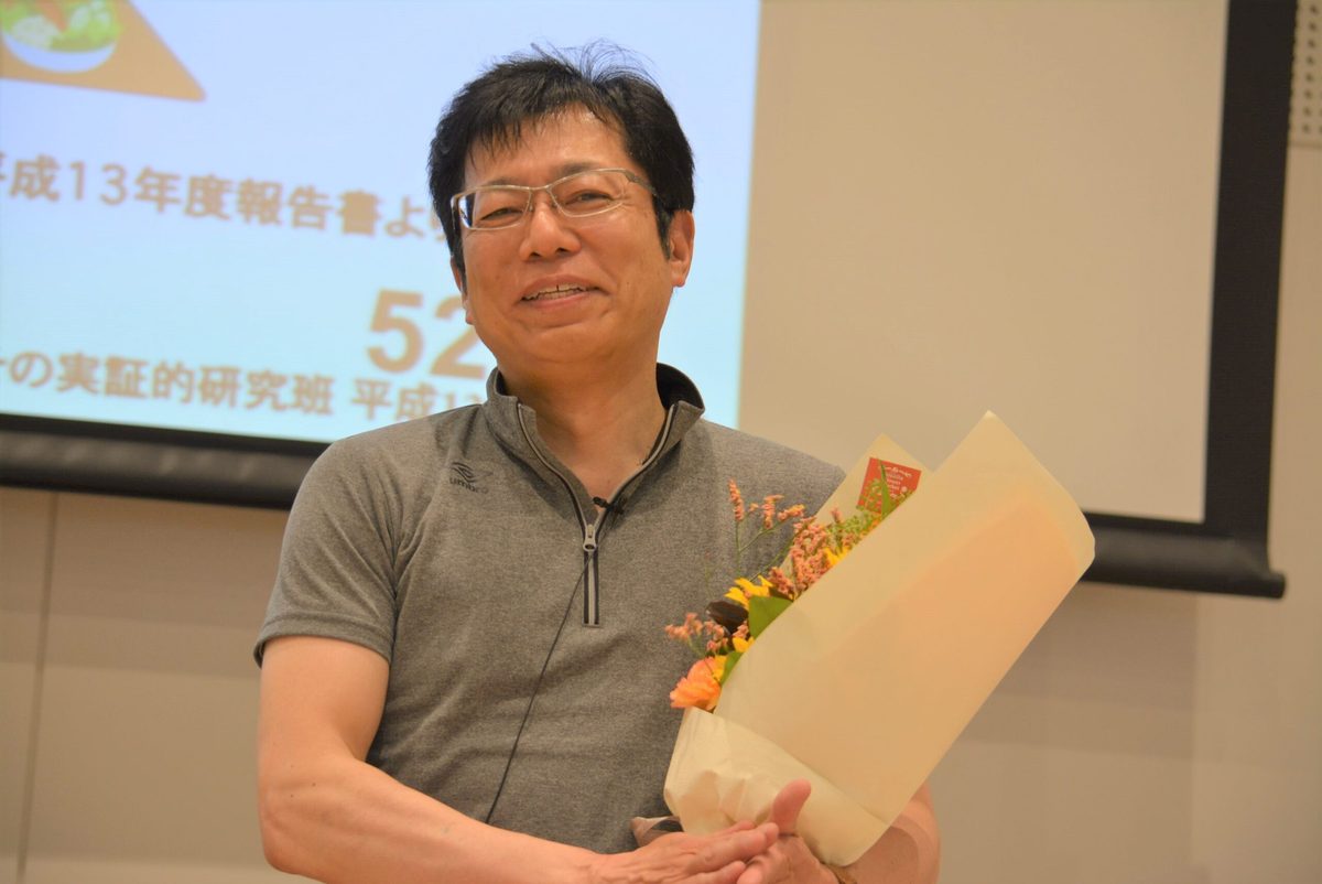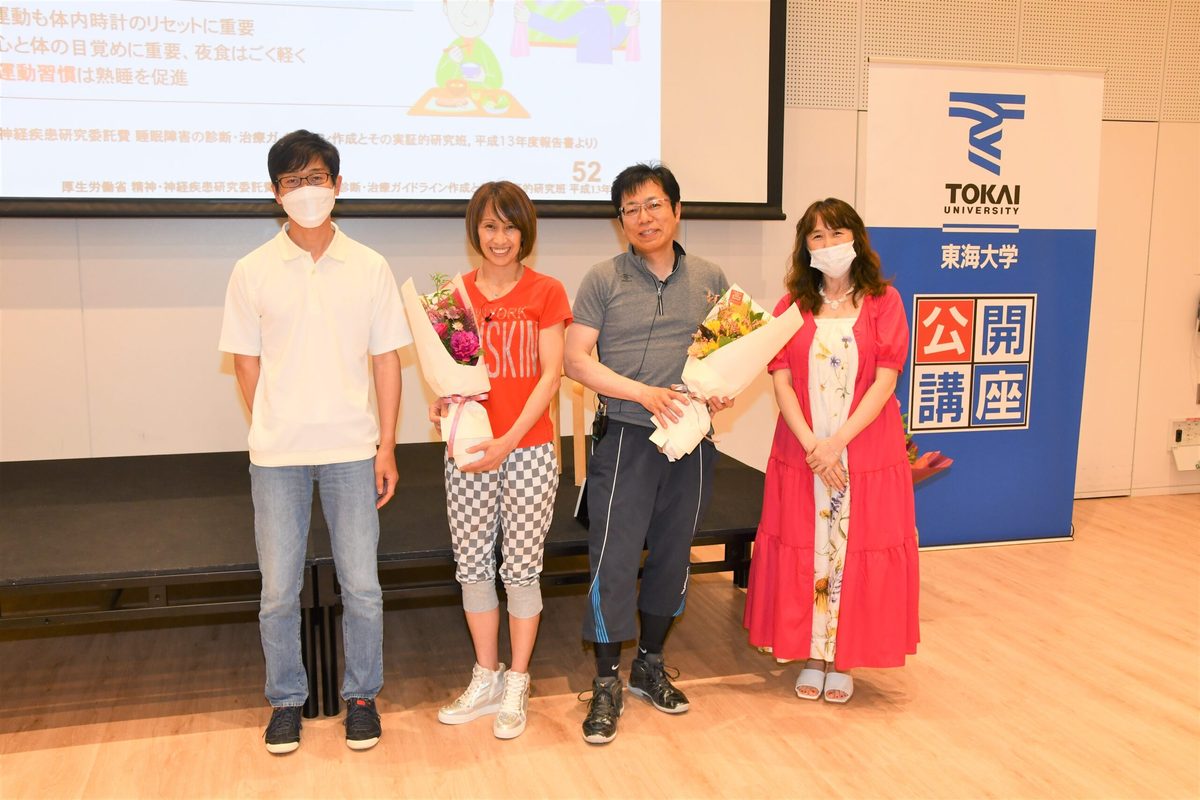 閉会挨拶のタイミングでは、寺尾教授が所属し、片岡氏がインストラクターを務めるNASスポーツクラブの仲間達からサプライズで花束贈呈があり、寺尾教授、片岡氏を囲んで語り合う様子が見られました。参加者からは、「睡眠と背骨コンディショニングに関するお話を通じて、総合的に体の仕組みを学び、あらためて健康について考えるきっかけになりました」といった声が聞かれました。