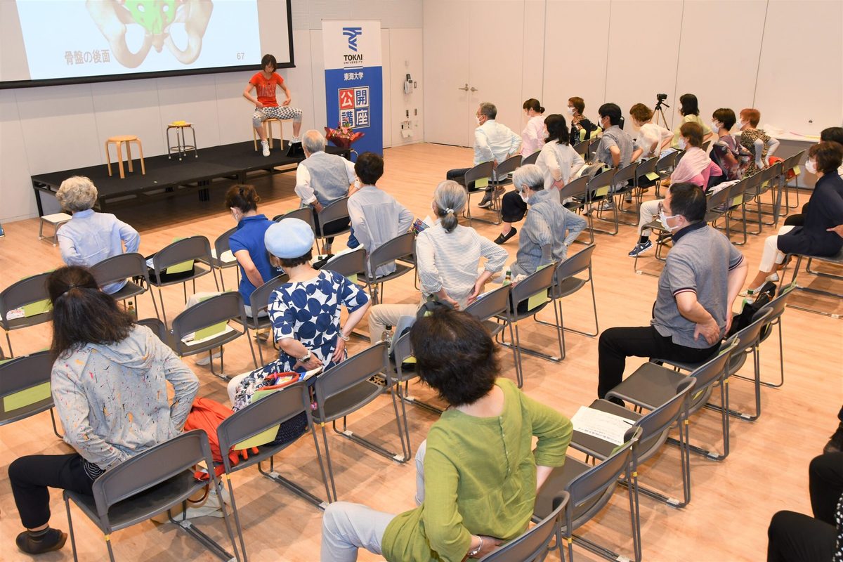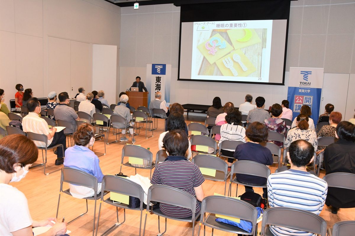 札幌キャンパスでは6月26日に札幌市民交流プラザSCARTSコートにて東海大学公開講座ヒューマンカフェ「最高の睡眠を得るための健康法」を開催しました。生物学部生物学科の寺尾晶教授と一般社団法人背骨コンディショニング協会トップスペシャリストの片岡志保氏が講師を務め、第1部では寺尾教授が「生活リズム健康法」と題して、睡眠の基本に始まり、快眠を得るための日常生活の実践法までを分かりやすく講演。第2部ではフィットネスインストラクターとして体操教室や個別の施術などを手掛ける片岡氏が座ってできる体操を中心に「背骨コンディショニング」を紹介しました。